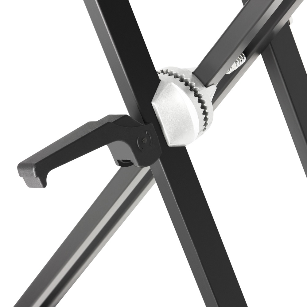 Klávesový stojan Oceľový stojan na klávesnicu s X-konštrukciou, dvojitou výstuhou a nastaviteľnou výškou pomocou rýchloupínacej skrutky. Gumové chrániče hrán samozrejme chránia prístroj pred poškodením a zabraňujú pohybu.