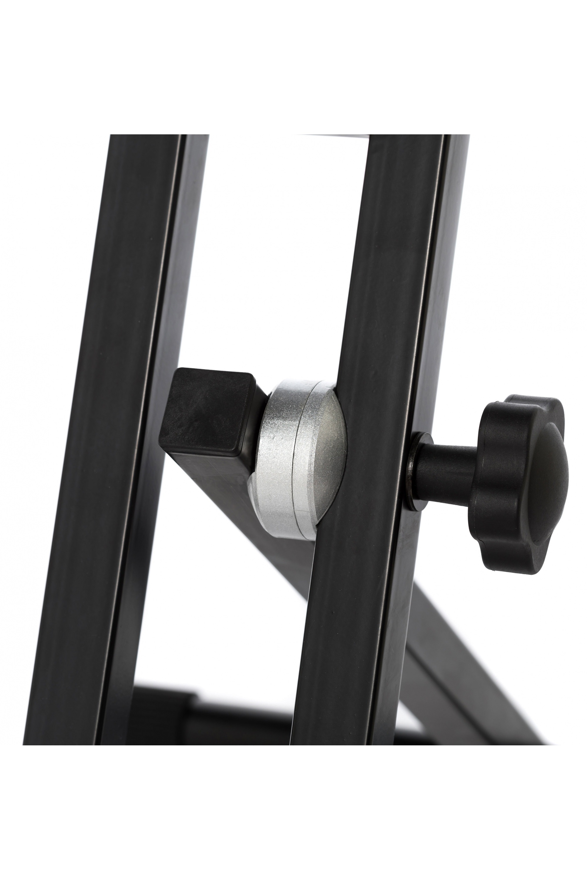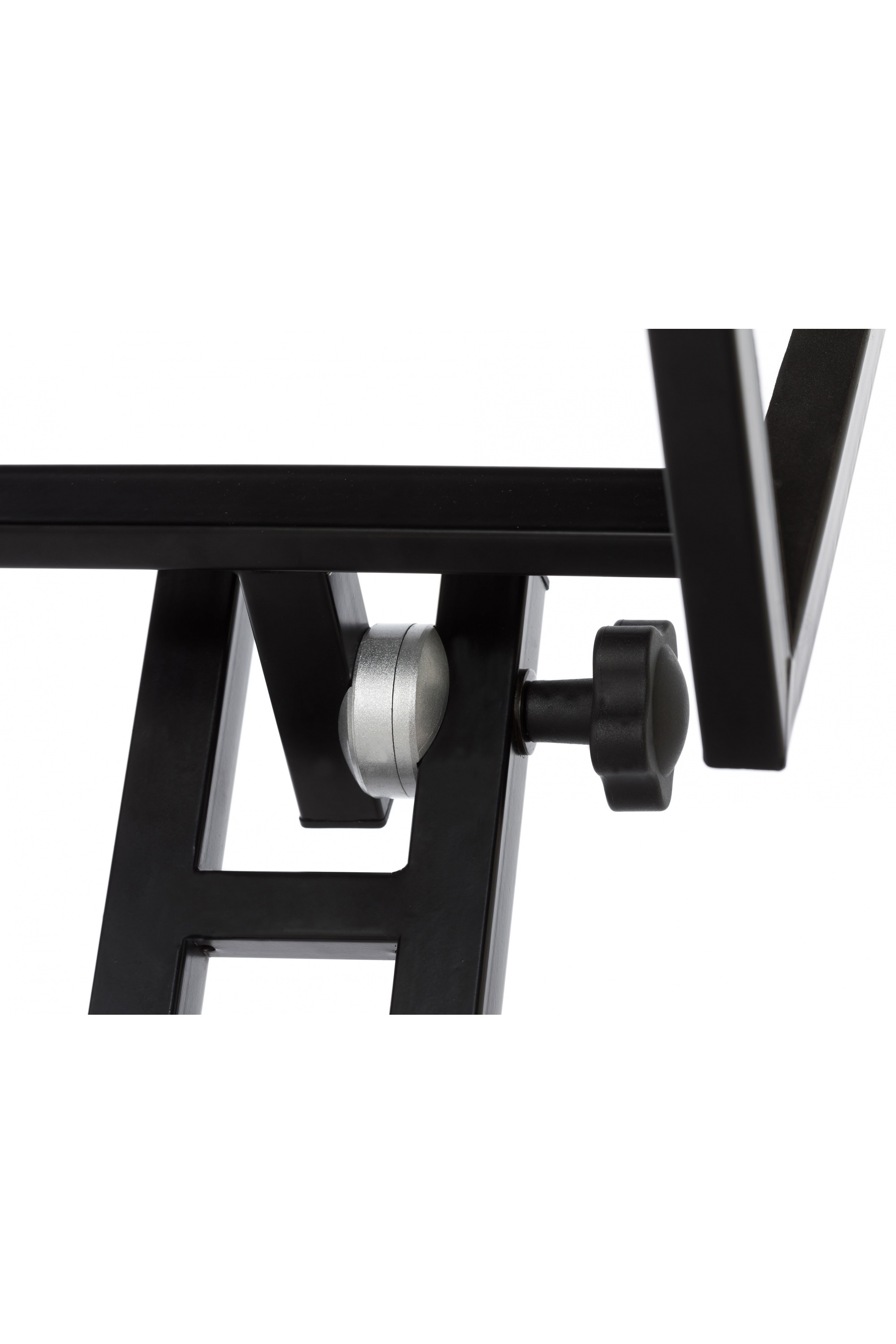 Stojan na mixážny pult Robustný oceľový stojan s nastaviteľnou výškou a sklonom vhodný pre kompaktnejšie mixážne pulty. Môže sa použiť aj ako stojan pre gitarový/basový zosilňovač. Nohy stojana sú z pogumovaného protišmykového materiálu. Vzdialenosť medzi ramenami je 30 cm.
