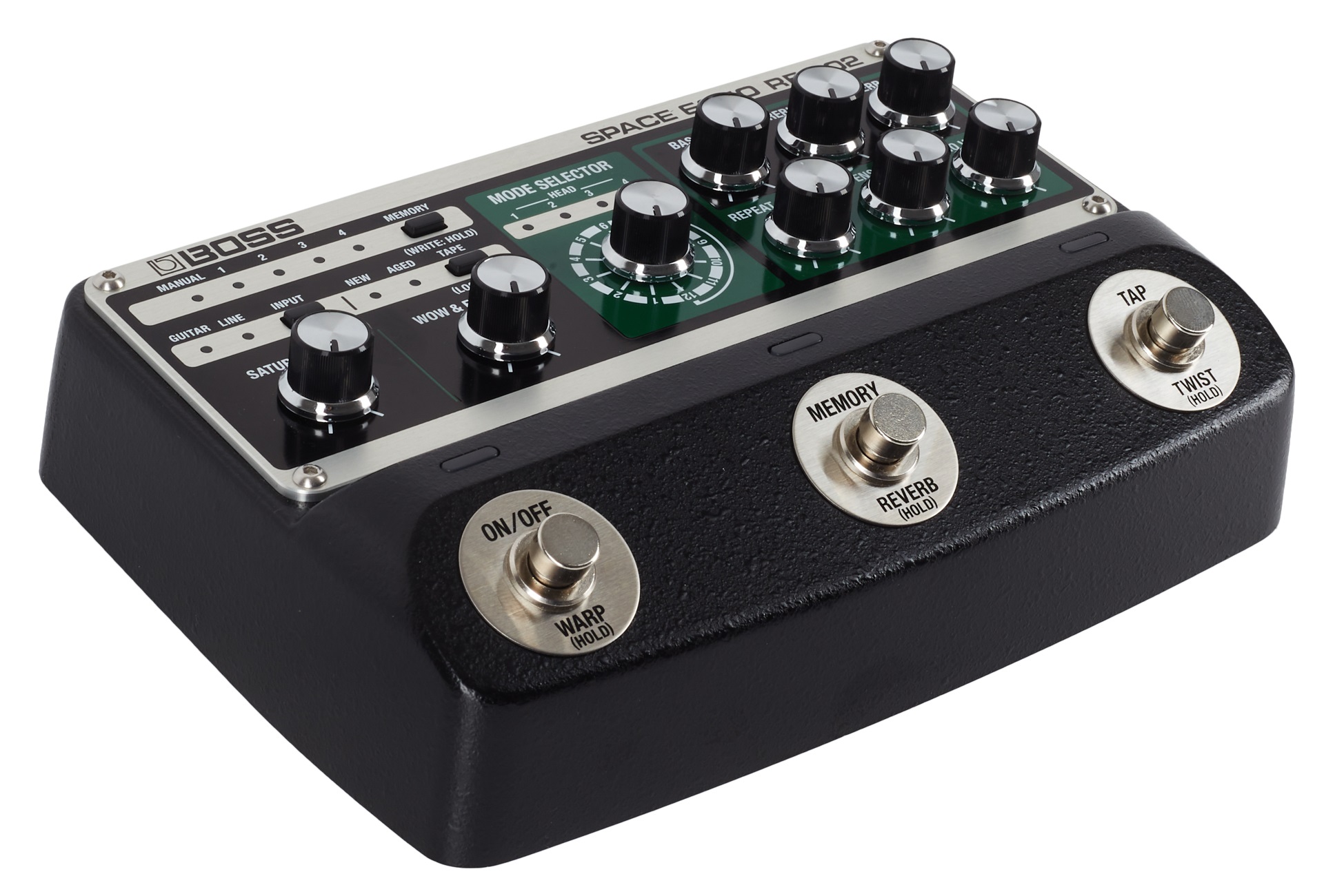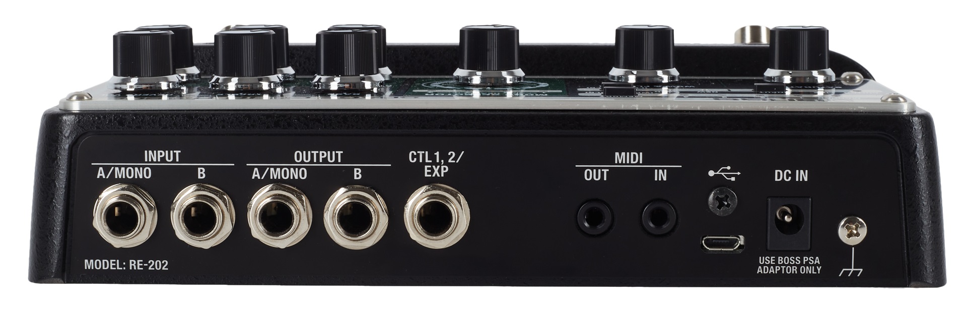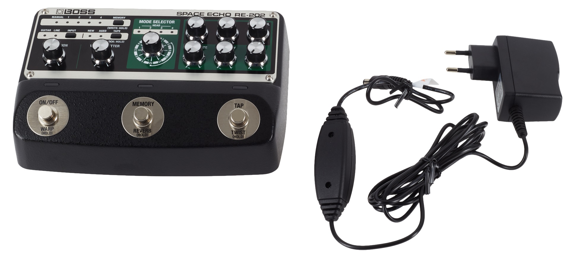 Gitarový efekt Legendárne analógové páskové echo Roland RE-201 Space Echo vyrábané v rokoch 1974 až 1990 sa vracia v podobe BOSS RE-202, komplexného delay pedálu s množstvom moderných funkcií. Pedál ponúka klasickú konfiguráciu troch páskových hláv originálu plus pridanú páskovú hlavu – celkovo 12 režimov, jedinečných kombinácií efektov reverb, echo a delay. Všetky procesy/zmeny, ako napríklad postupná zmena ladenia pri otáčaní gombíka Repeat Rate a doznievajúca spätná väzba pri otočení gombíka Intensity úp