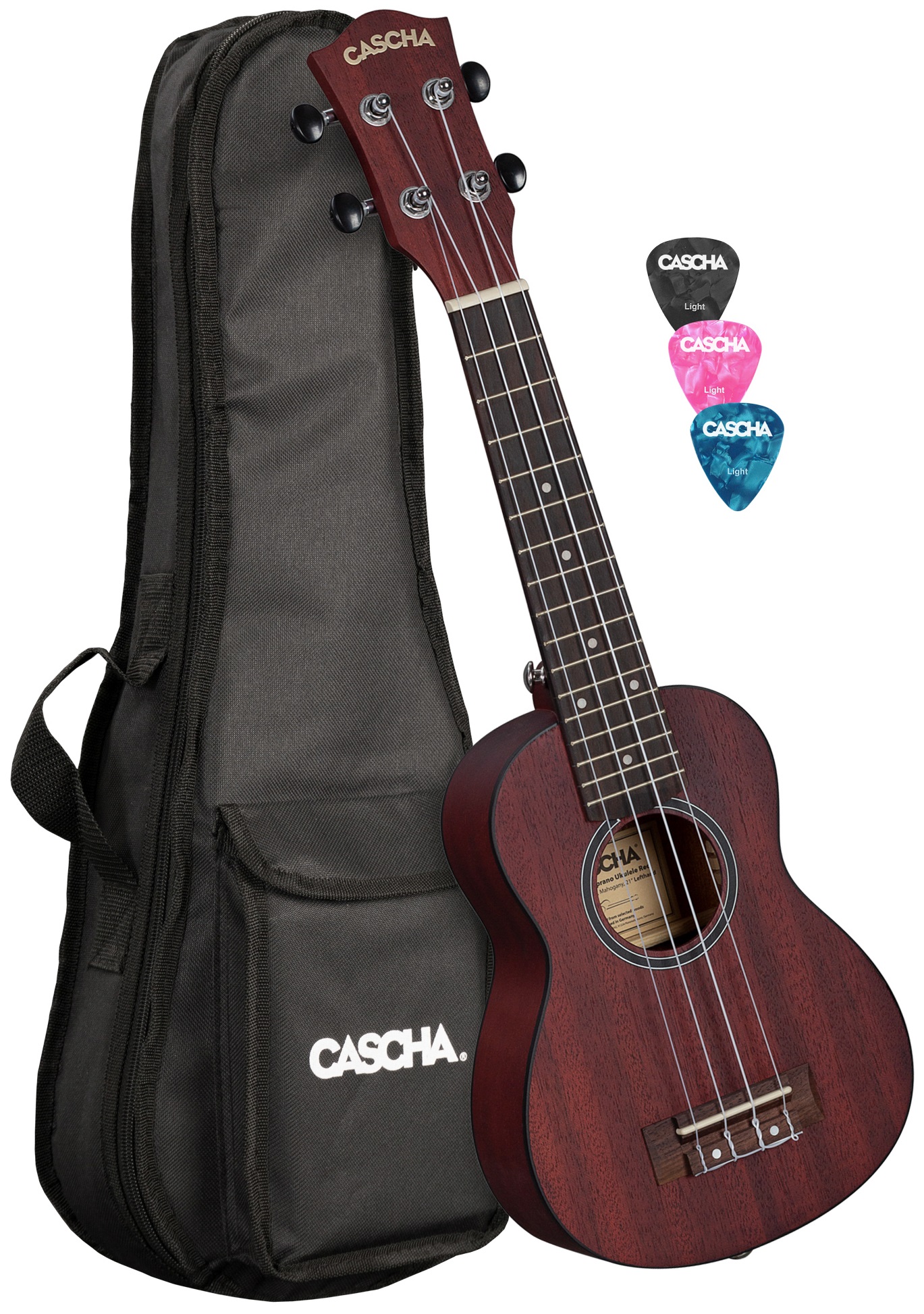 Ľavoručné akustické ukulele Ukulele Cascha HH 2263L Soprano Mahogany LH Red pre ľavákov zo série Mahogany je cenovo dostupný nástroj, ktorý poteší deti aj dospelých. Spolu s ukulele dostanete praktické polstrované puzdro a tri trsátka, takže sa môžete rovno pustiť do zábavy. Telo ukulele je vyrobené z laminovaného mahagónu. Palisandrový hmatník je rozdelený šestnástimi pražcami. Struny držia vo firemných ladiacich mechanikách gitarového štýlu a palisandrovom hmatníku. Štýl je zvýraznený rozetou a obojstrann