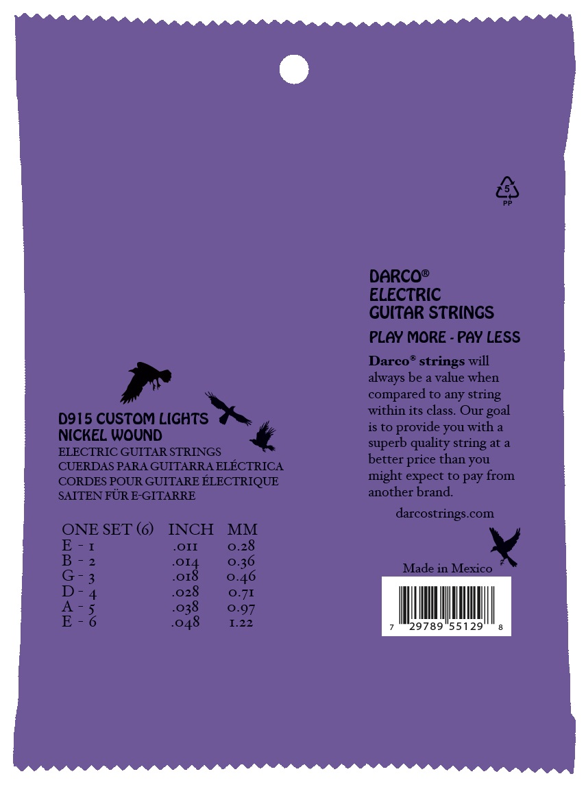 Struny na elektrickú gitaru Struny pre elektrickú gitaru Darco stelesňujú filozofiu „Hrajte viac. Platíte menej.“ Ponúkajú precízne remeselné spracovanie a prvotriedny zvuk za skutočne symbolickú cenu. V tejto cenovej kategórii budete ťažko hľadať struny, ktoré vám budú slúžiť tak dobre ako Darco. Ideálna voľba pre každého, kto neverí, že na dobré hranie je potrebné minúť celé imanie. Struny sú vyrobené v Mexiku a majú oceľové jadro a niklované oceľové vinutie, vďaka čomu produkujú frekvenč