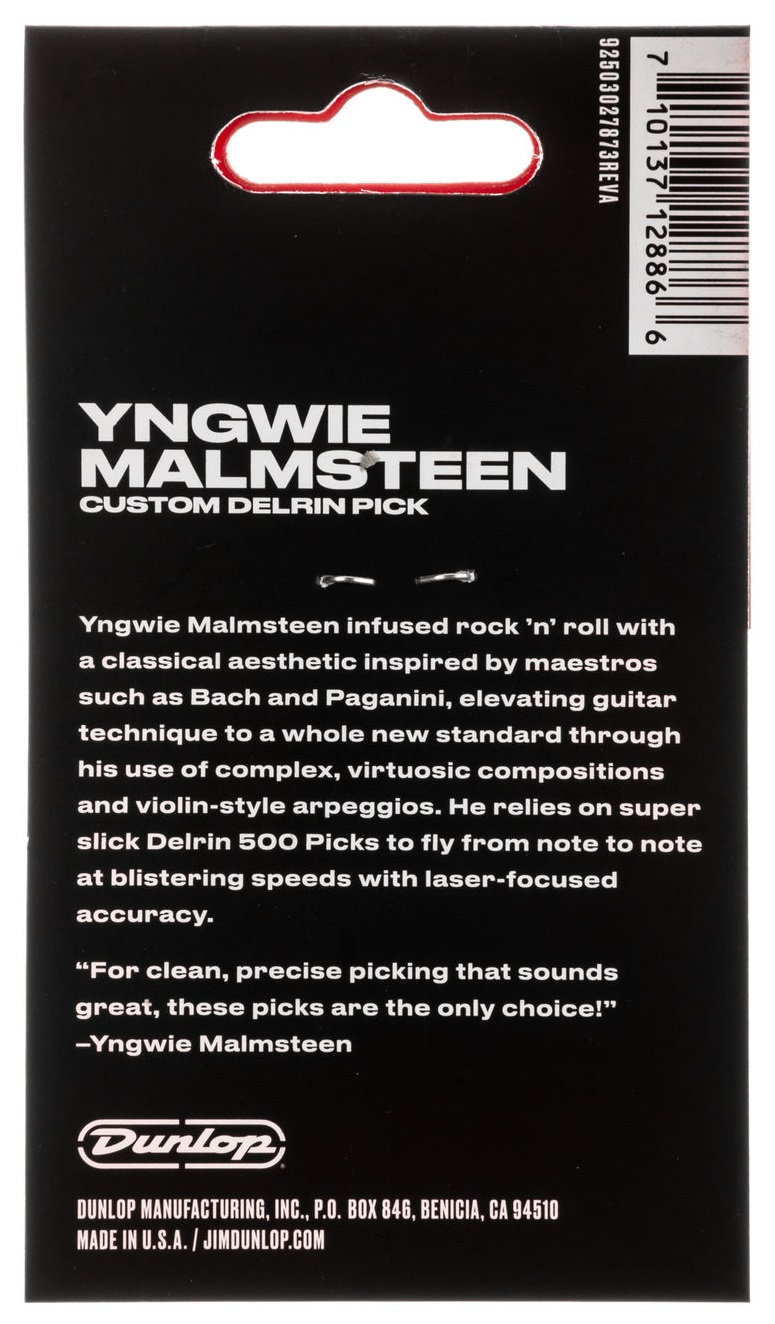 Brnkátka Podpisové trsátka švédskeho gitaristu Yngwieho J. Malmsteena vychádzajú zo série Dunlop Delrin 500. Ide o trsátka s výnimočne hladkým povrchom a špeciálne zaoblenými hranami, takže po strunách kĺžu s minimálnym odporom. Sú pevné, odolné, ale dostatočne pružné, aby sa s nimi pohodlne hralo, a ponúkajú teplý, prirodzený zvuk, ktorý pripomína prstovú hru. Samozrejme, sú vybavené originálnou grafikou inšpirovanou Malmsteenom a kópiou jeho podpisu na zadnej strane. Stru