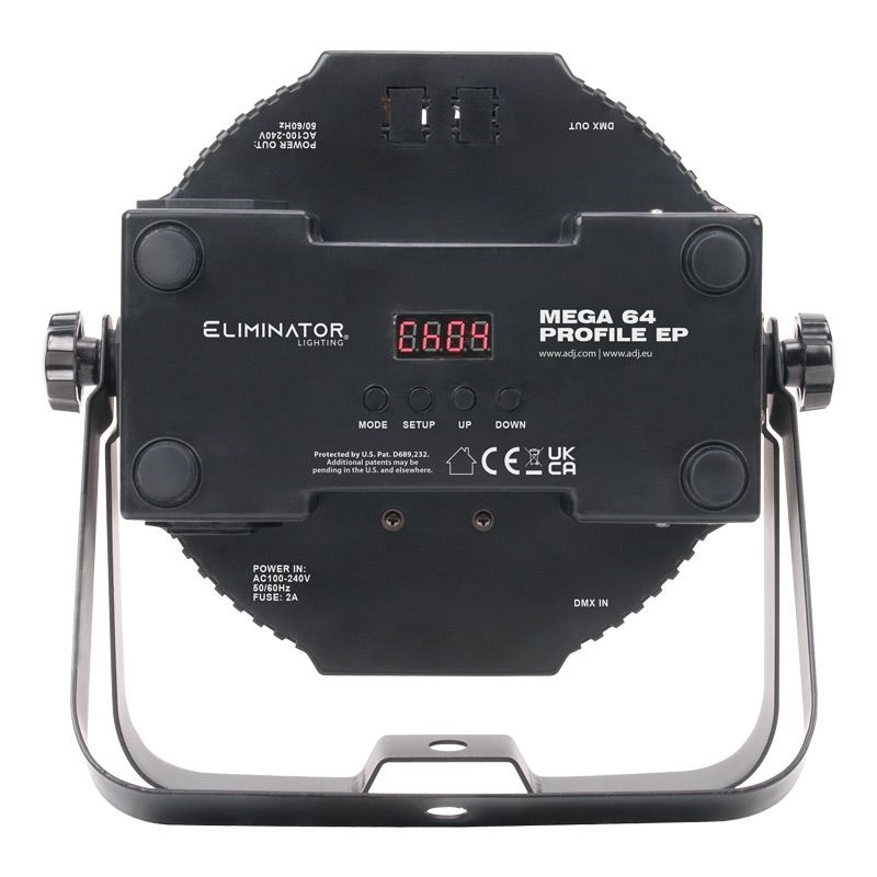 LED PAR reflektor Reflektor Eliminator Mega 64 Profile EP LED PAR je ideálny na osvetlenie koncertných pódií, keď je namontovaný na konštrukcii pódia alebo môže byť umiestnený na zemi na atmosférické osvetlenie stien alebo "up light" osvetlenie. Jeho svetelný zdroj pozostáva z dvanástich 4W RGB + UV LED diód, ktoré vám poskytujú bohaté možnosti miešania farieb na vytvorenie rôznych farieb. Súčasťou je aj ultrafialové svetlo na vytváranie fosforeskujúcich sv
