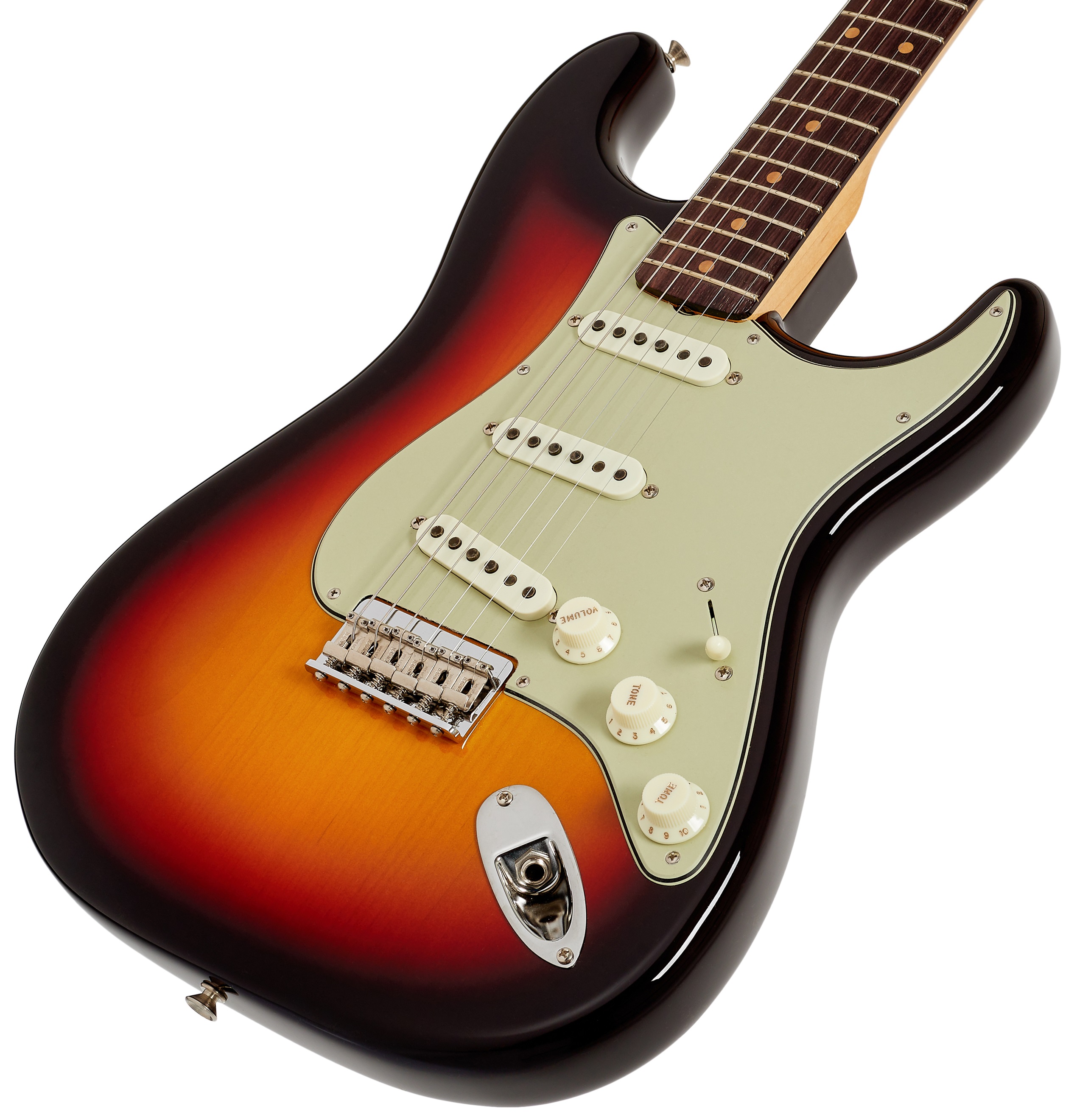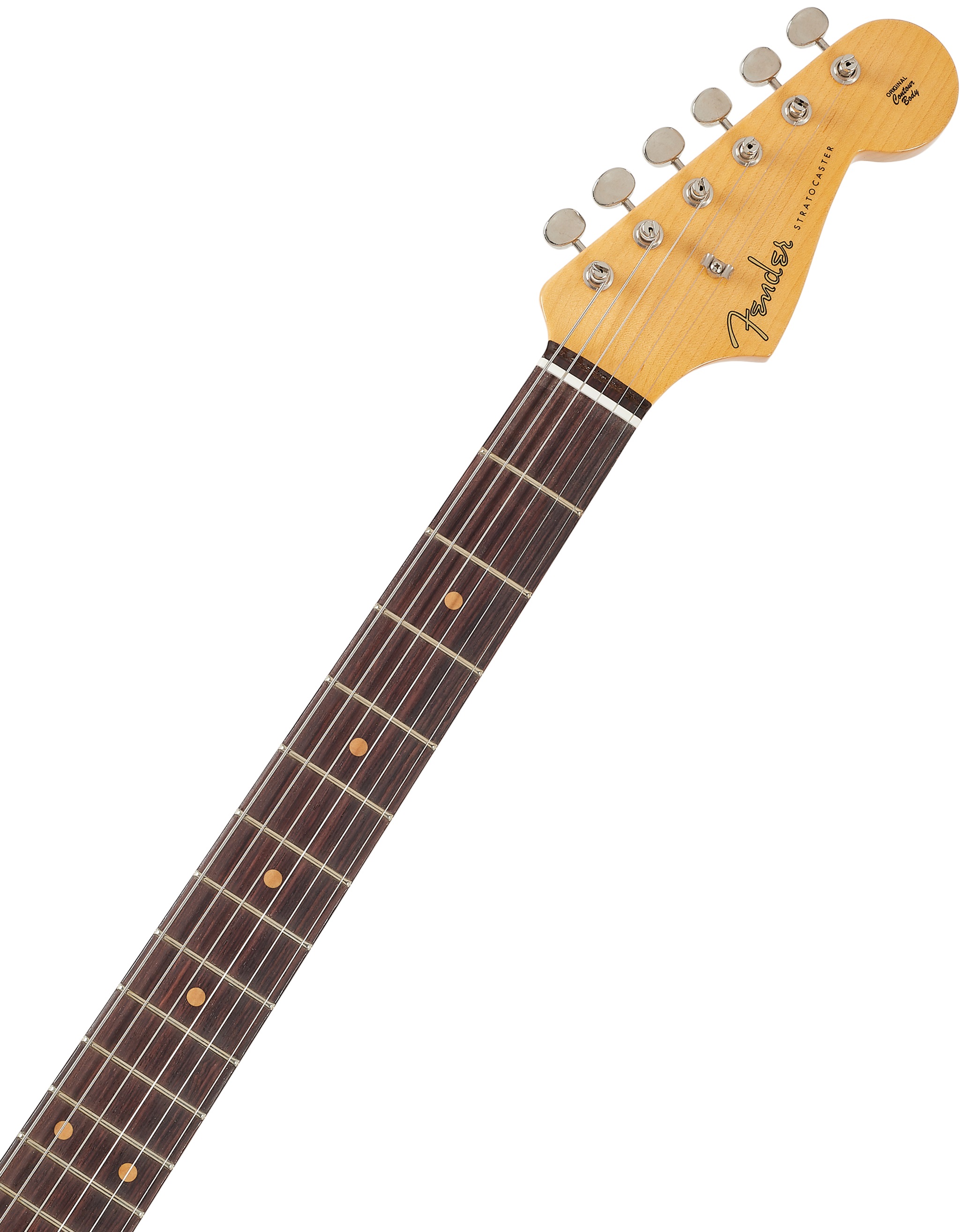 Elektrická gitara Tovar vykazuje známky opotrebenia v dôsledku častého používania alebo dlhodobého vystavenia v obchode (pozri foto). Fender Vintage Custom 59 Hardtail Strat Time Capsule je jedinečný nástroj z Fender Custom Shop. Okrem dizajnových zmien zavedených v roku 1959 (palisandrový hmatník, trojvrstvový mätovo zelený chránič pripevnený ôsmimi, deviatimi alebo desiatimi skrutkami v závislosti od mesiaca výroby) sa od štandardných modelov Strat líši tým, že má pevný strunový most, čo tiež zvyšuje jeho
