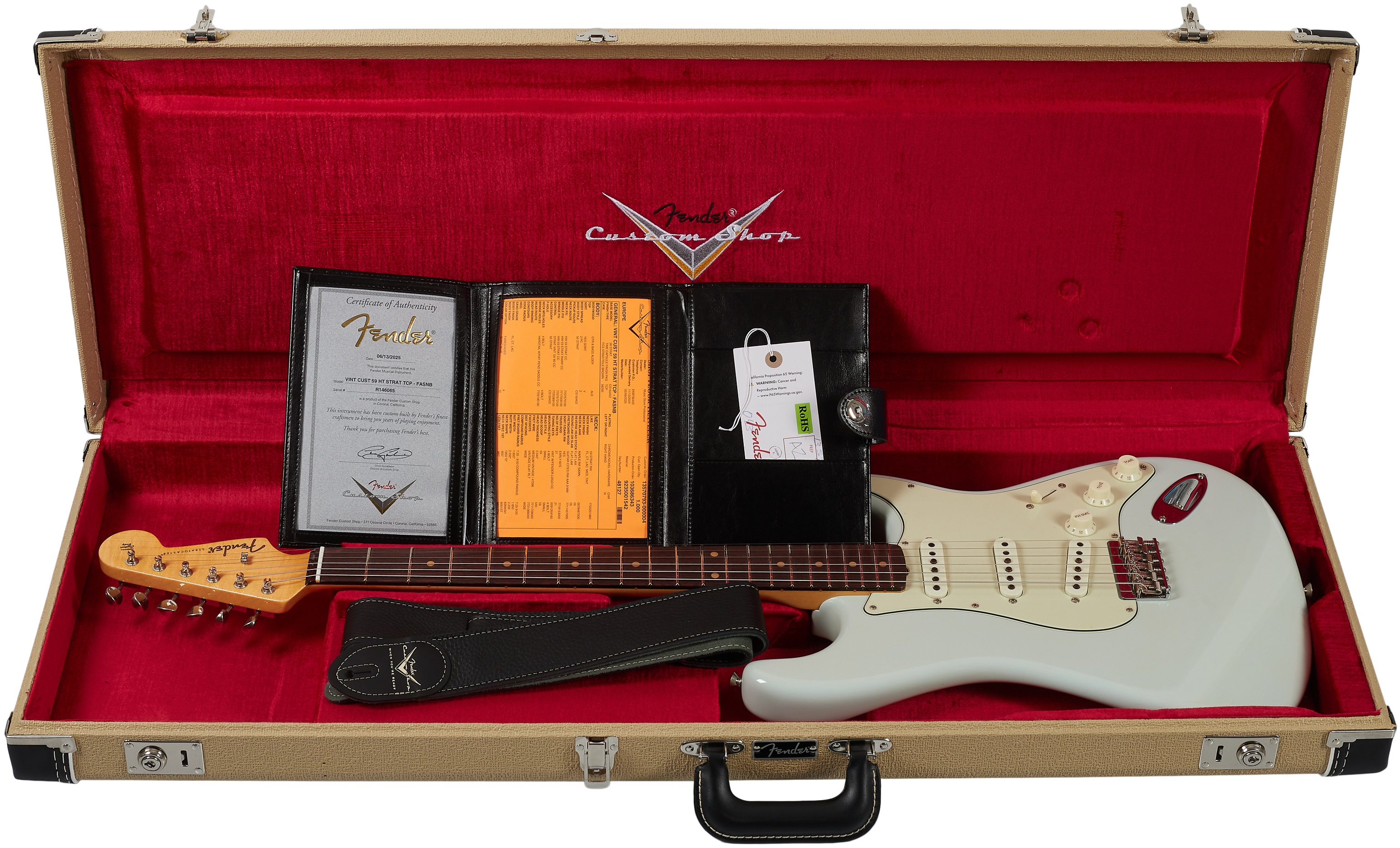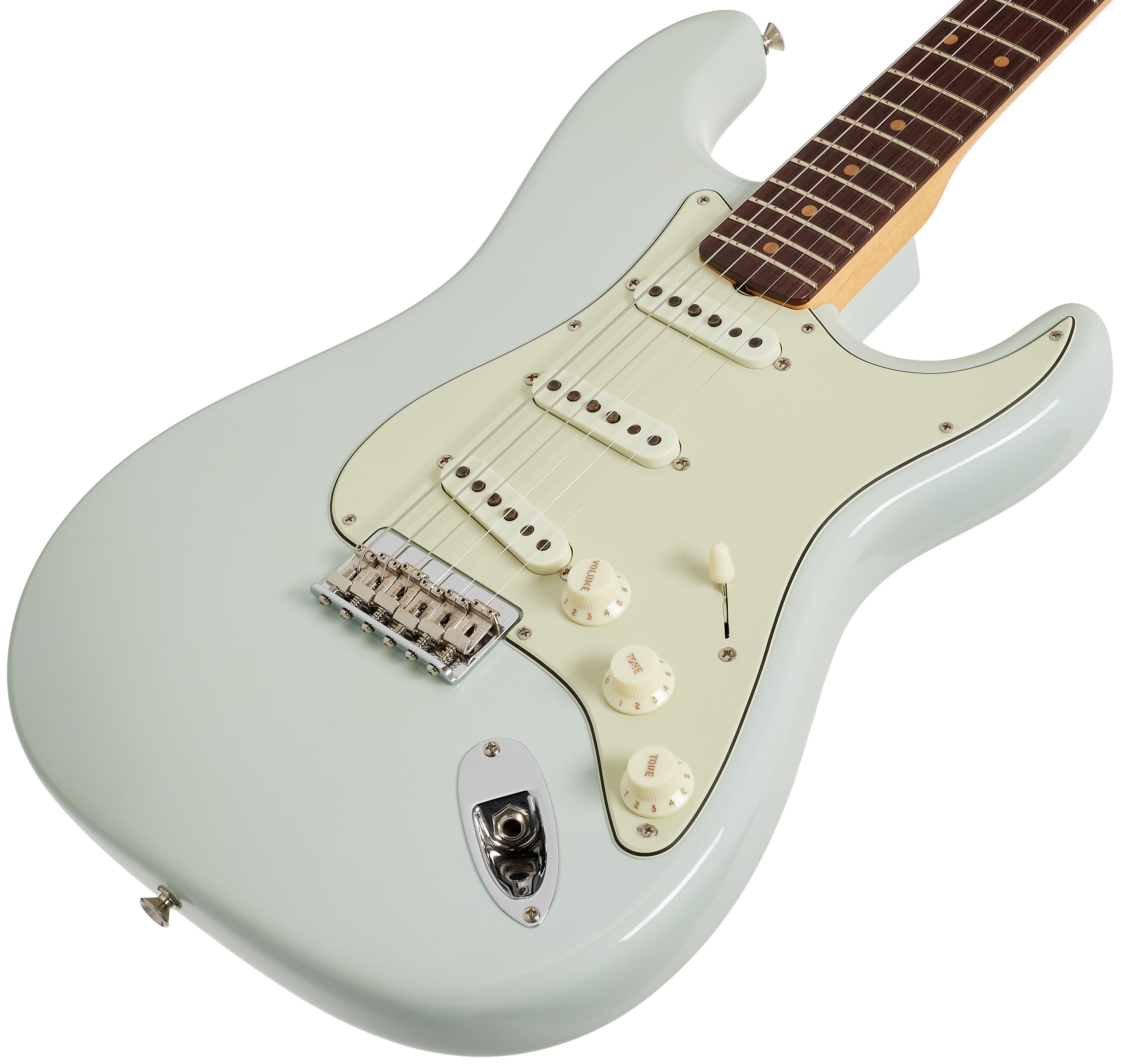 Elektrická gitara Tento produkt vykazuje známky opotrebenia v dôsledku častého používania alebo dlhodobého vystavenia v obchode (pozri foto). Fender Vintage Custom '59 Hardtail Strat Time Capsule Package Faded Aged Sonic Blue je jedinečný nástroj z Fender Custom Shop. Okrem dizajnových zmien zavedených v roku 1959 (palisandrový hmatník s vulkanizovanými vláknovými značkami polohy označenými ako „clay dots“, trojvrstvový mätovo zelený pickguard pripevnený ôsmimi, deviatimi alebo desiatimi sk