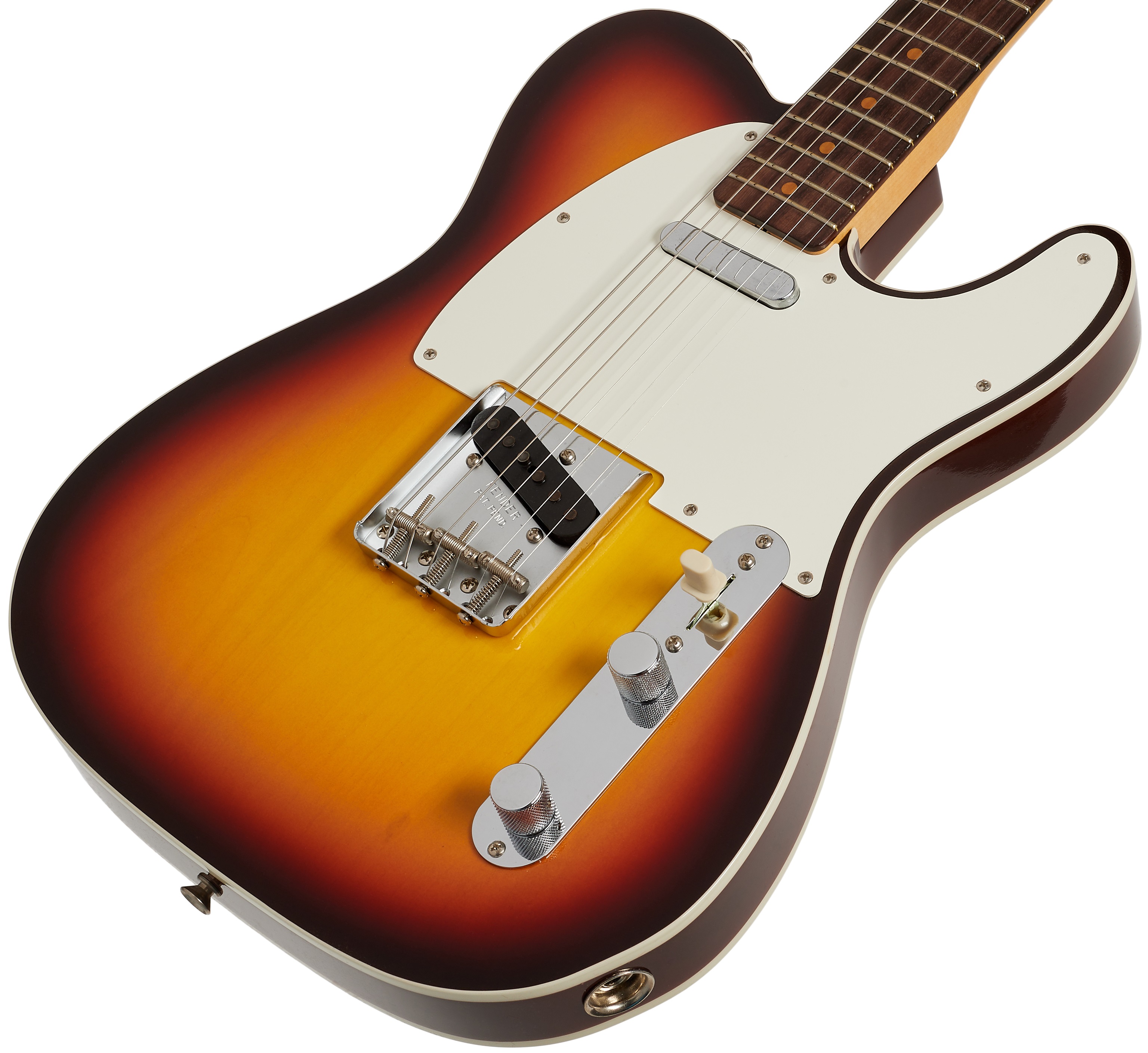 Elektrická gitara Fender Vintage Custom 1959 Telecaster Custom NOS, palisandrový hmatník, Chocolate 3-Color Sunburst je jedinečný nástroj z dielne Fender Custom Shop. Telo gitary, vyrobené z dvoch ručne vybraných kusov jelše, zdobí obojstranná obvodová väzba. Veľmi tenká vrstva laku (NOS finish) bez umelej patiny v podobe reliktných/starších povrchových úprav umožňuje drevu "dýchať" a dobre rezonovať. K javorovému krku (rift-sawn) s dobovým '59 veľkým "C" profilom je prilepený palisandrový