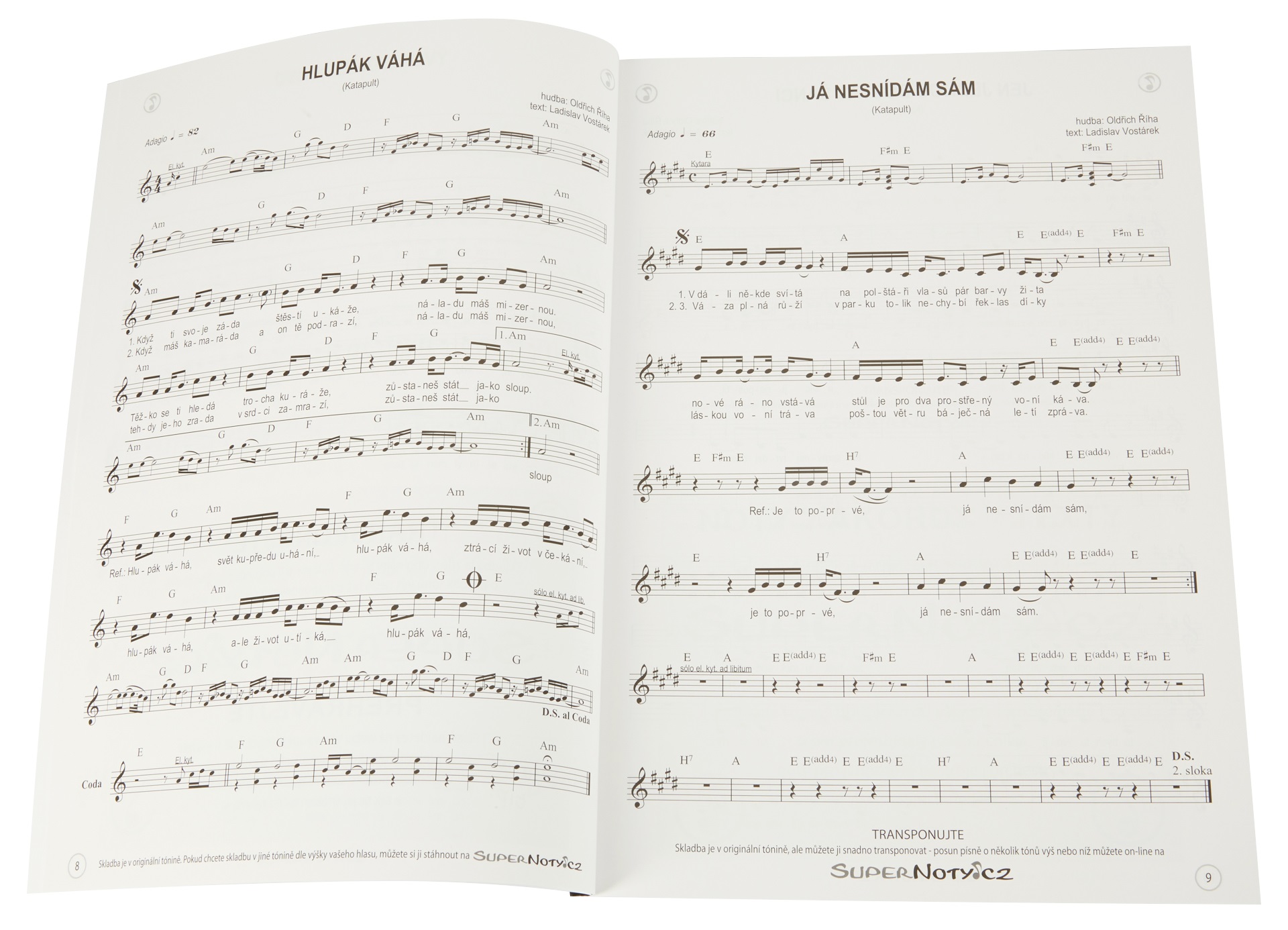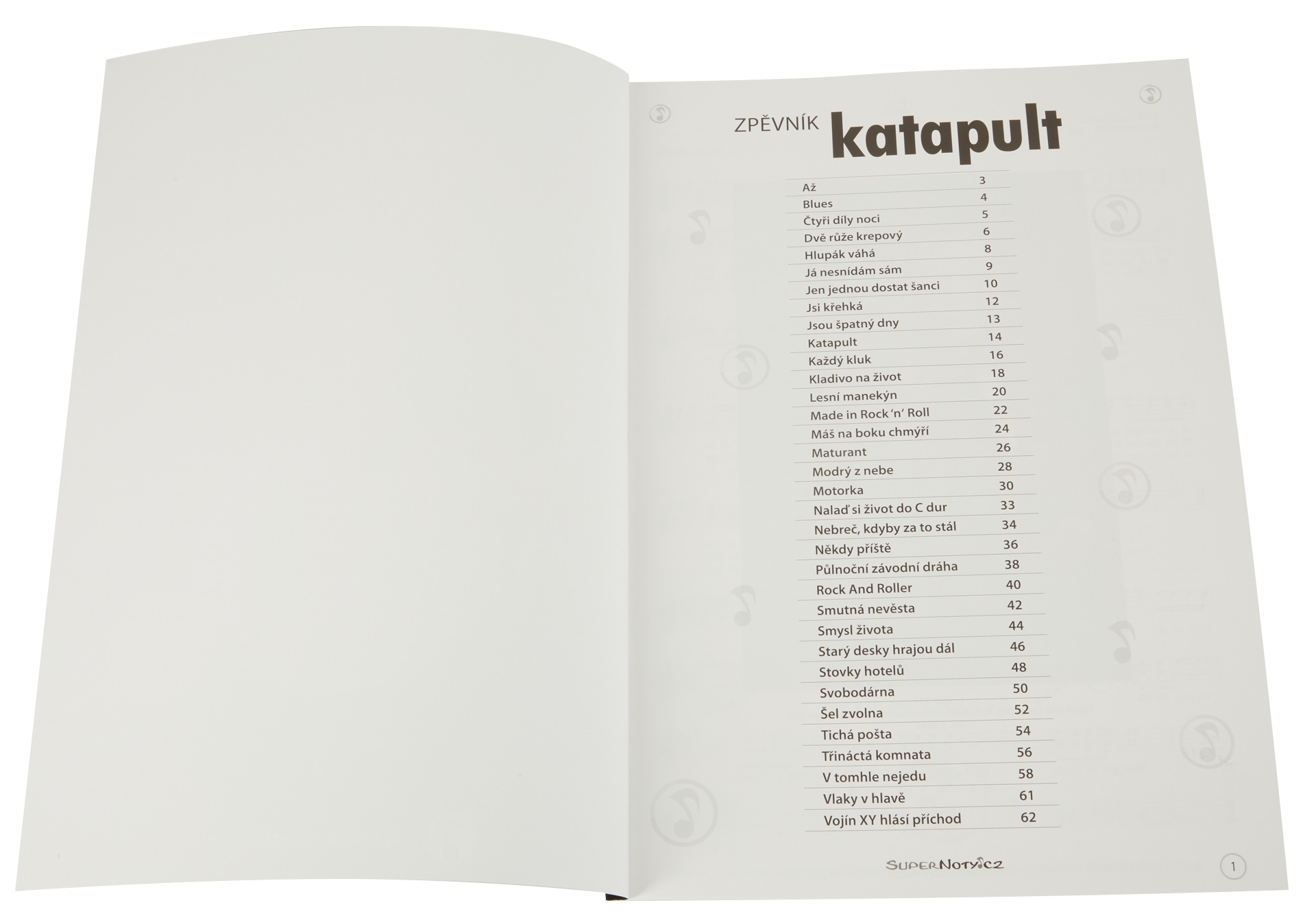 Spevník Spevník obsahuje 34 najväčších hitov skupiny KATAPULT, upravených predovšetkým pre gitaristov. Každá pieseň obsahuje notový zápis, text a akordy, pokyny pre elektrickú gitaru a zapísané sóla, vrátane gitarových intier. Notový zápis bol napísaný profesionálnymi hudobnými skladateľmi a spevník je výnimočný vysokou kvalitou svojho notového zápisu. Je to prvýkrát, čo bol spevník Katapultu vydaný v knižnej podobe. Zoznam skladieb: , Až , Blues , Čtyři díly noci , Dvě růže krepový , Hlupák váhá , Já nesní