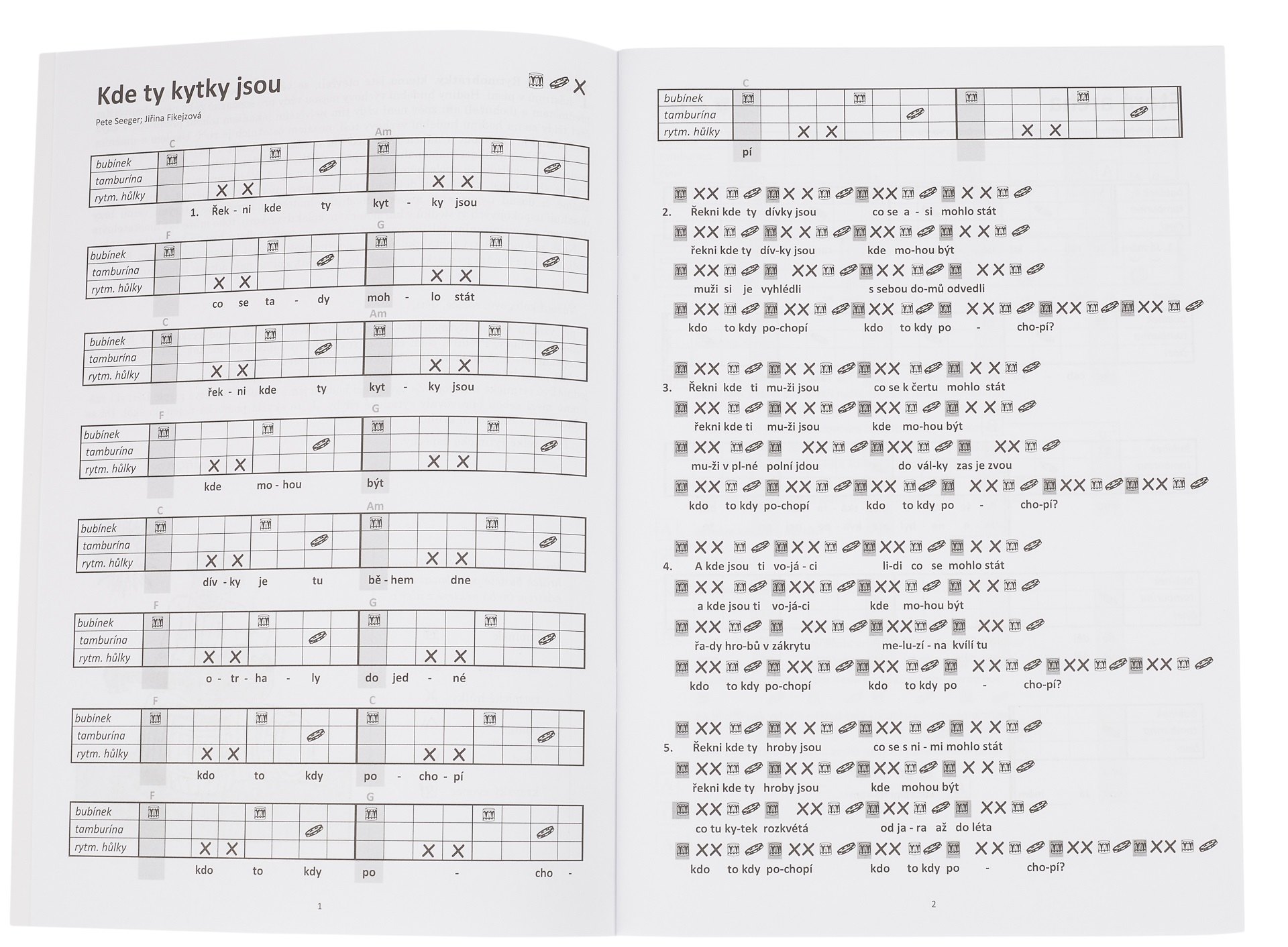 Škola hry na perkusiách Táto publikácia sa zameriava na používanie bicích nástrojov v piesňach. Ako všetci vieme, bicie nástroje sa môžu stať „zbraňami“ v rukách detí – môžu nimi udrieť suseda po hlave alebo bubeníckymi paličkami pichnúť kamaráta do chrbta. Je veľmi dôležité zapojiť žiakov, aby sa to nestalo. Pri tvorbe týchto Rytmohrátok som mohla vyskúšať niektoré piesne v hudobnej výchove. Predtým som vyskúšala rôzne typy notácie, ale nič nefungovalo tak dobre ako zapisovanie nástrojov v jednotlivých tak