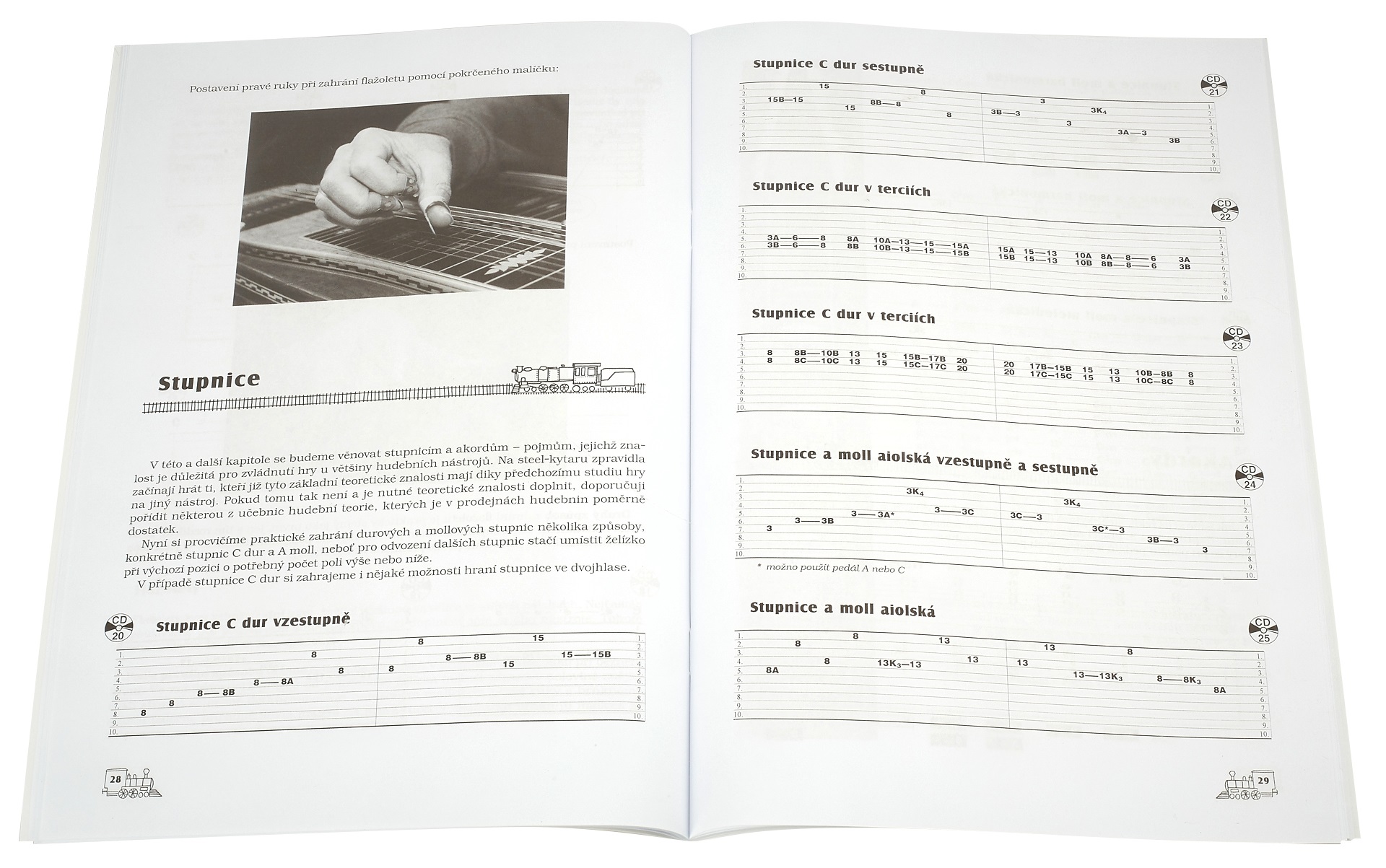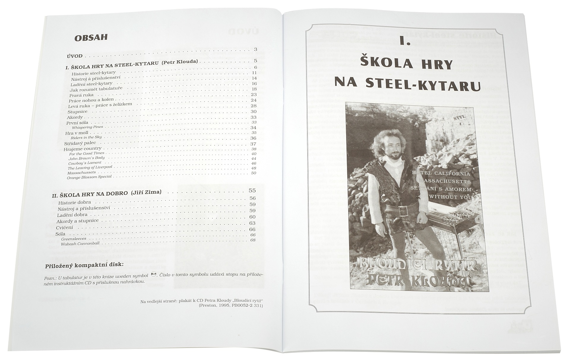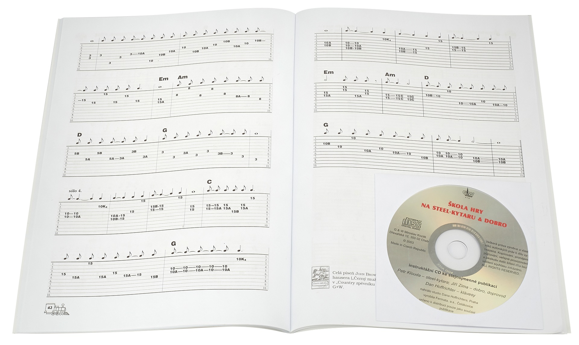 Škola hry na steel gitare a dobre Ladenie, porozumenie tabulatúre, pravá ruka, ľavá ruka – práca s trsátkom, stupnice, akordy, sóla, striedavý palec, 6 country piesní. Autor: Petr Klouda. DOBRO: história, ladenie, akordy a stupnice, cvičenia, sóla. Autor: Jiří Zima. Všetky ukážky sú k dispozícii aj na CD. Noty, tabulatúry, fotografie