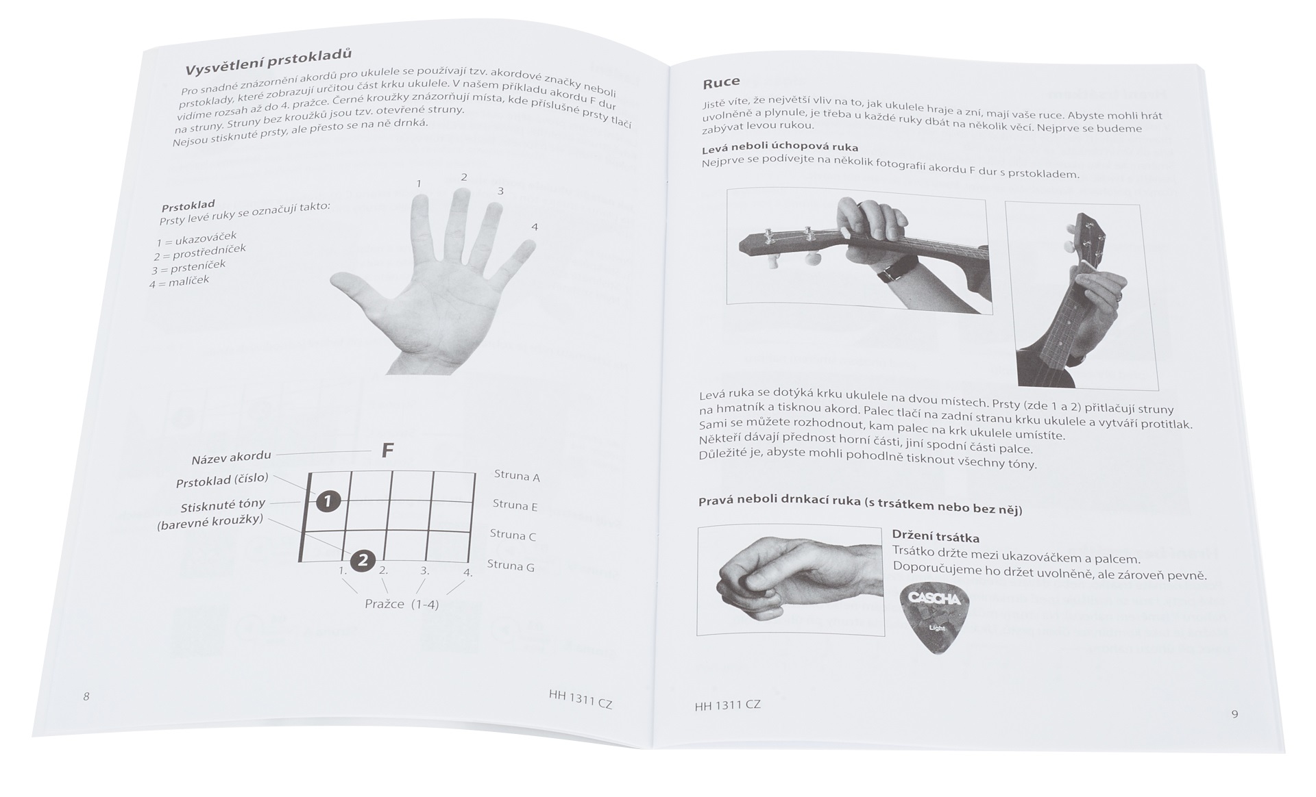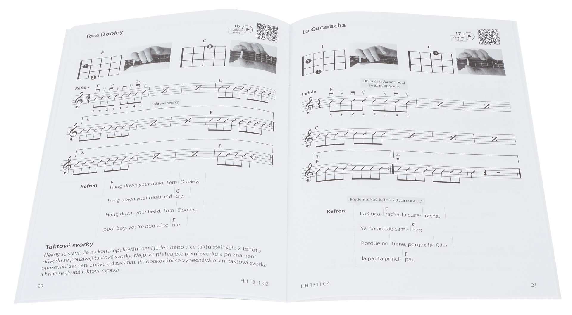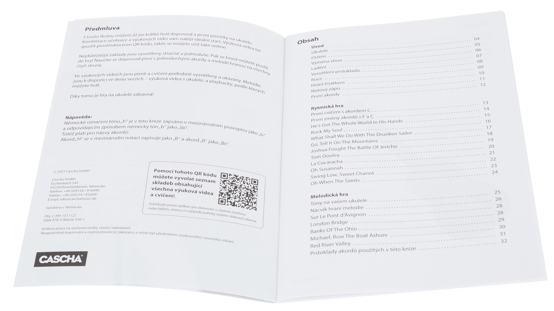 Škola hry na ukulele S touto školou budete schopní hrať svoje prvé jednoduché pesničky na ukulele v priebehu krátkej doby. Publikácia používa kombináciu tlačeného učebného materiálu a inštruktážnych videí, ku ktorým máte prístup prostredníctvom QR kódu, takže sa môžete učiť online. Základy sú vysvetlené stručne a jednoducho. Rýchlo sa naučíte hrať akordové sprievody a melódie na všetkých štyroch strunách ukulele. Sprievodné videá vysvetľujú a demonštrujú piesne a cvičenia. Inštruktážne videá sú doplnené spr