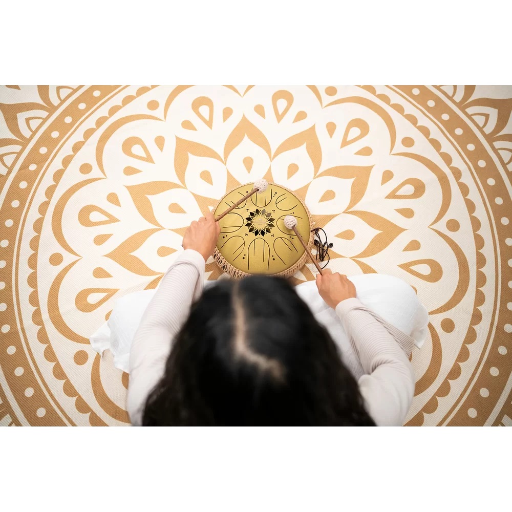 Tongue drum Oceľový bubon Meinl Sonic Energy 10" Medium Octave Tongue Drum je vyrobený z vysokokvalitnej nehrdzavejúcej ocele a ponúka osem tónov v rozsahu dvoch oktáv. To vytvára krásny a meditatívny zvuk podobný zvuku handpanu. Vďaka zvukovému otvoru umiestnenému na spodnej časti bubna môže byť zvuk ešte kompaktnejší, ak sa viečko zasunie silikónovou zátkou. Tri silikónové nožičky na spodnej časti bubna zabezpečujú, aby sa bubon neposúval. Bubon sa dodáva s dvoma drevenými paličkami s mäkkými gumenými hla