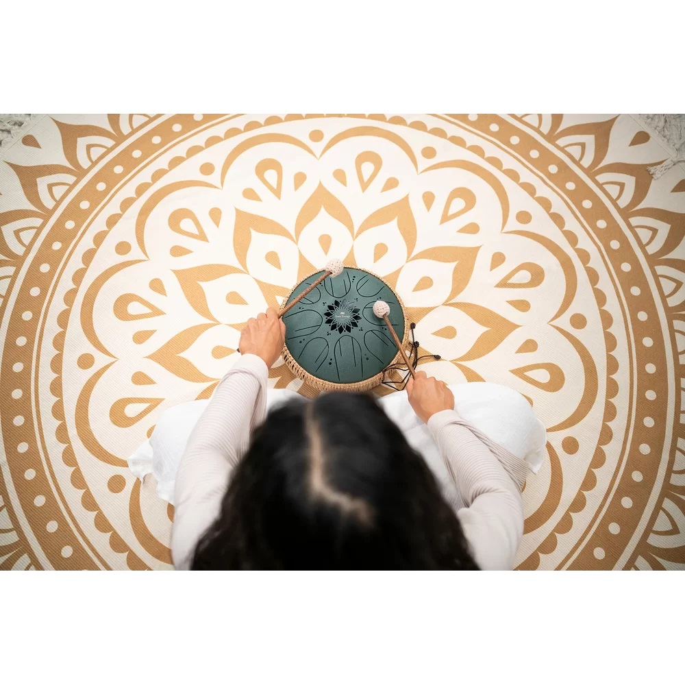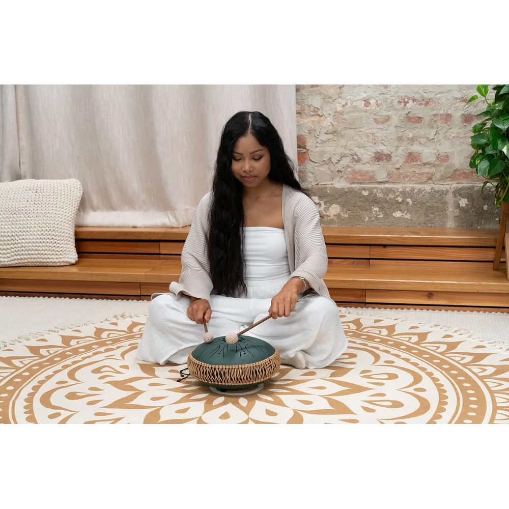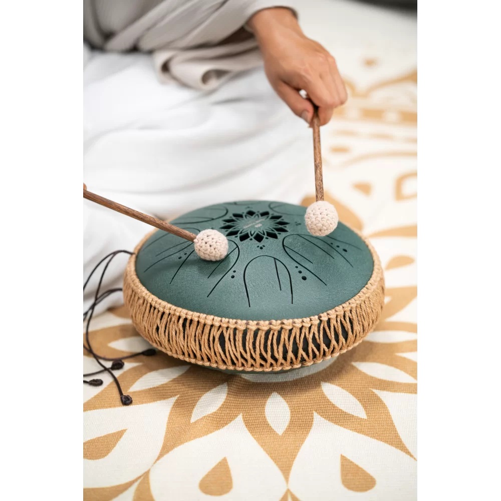 Tongue drum Oceľový bubon Meinl Sonic Energy 10" Medium Octave Tongue Drum je vyrobený z vysokokvalitnej nehrdzavejúcej ocele a ponúka osem tónov v rozsahu dvoch oktáv. To vytvára krásny a meditatívny zvuk podobný zvuku handpanu. Vďaka zvukovému otvoru umiestnenému na spodnej časti bubna môže byť zvuk ešte kompaktnejší, ak sa viečko zasunie silikónovou zátkou. Tri silikónové nožičky na spodnej časti bubna zabezpečujú, aby sa bubon neposúval. Bubon sa dodáva s dvoma drevenými paličkami s mäkkými gumenými hla