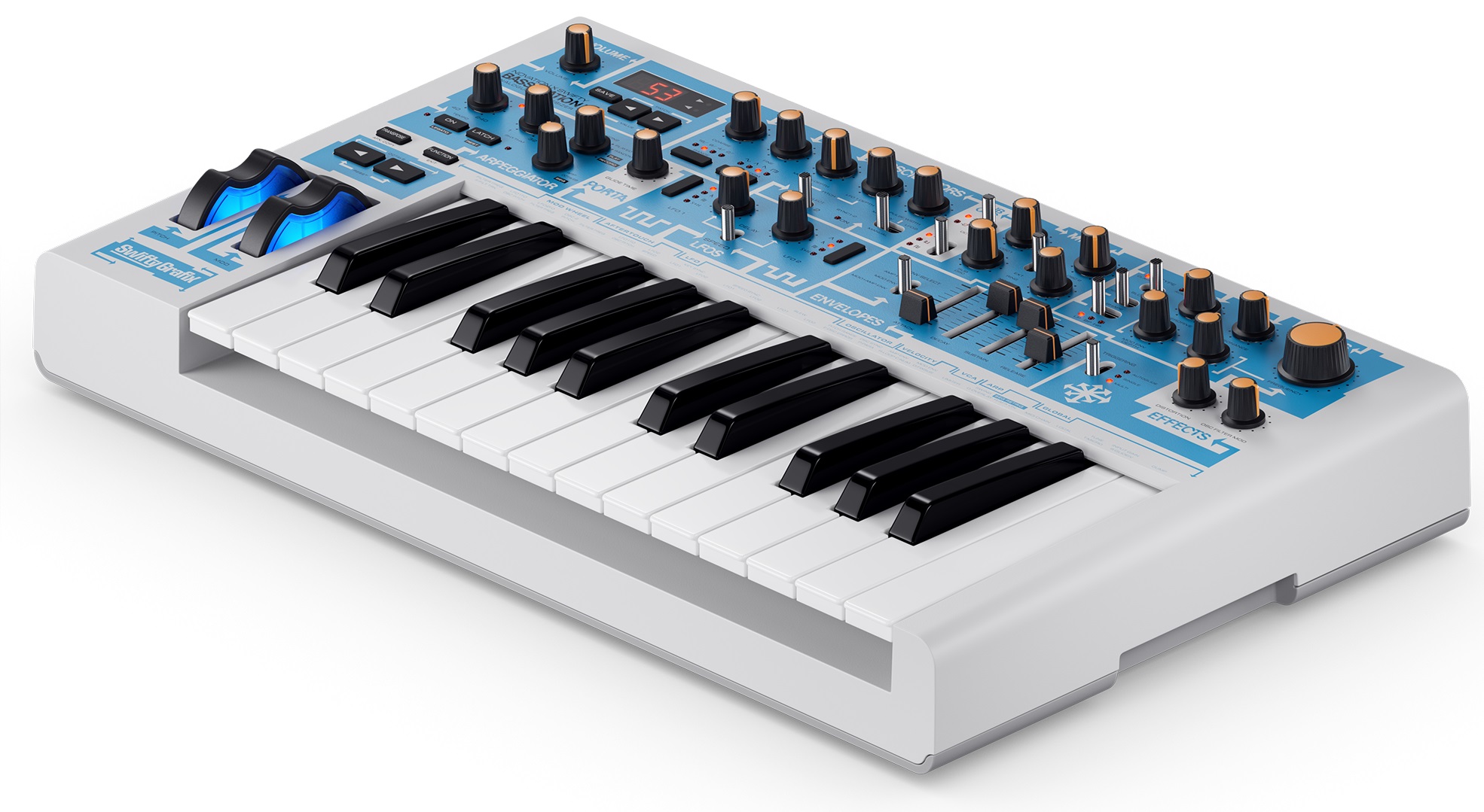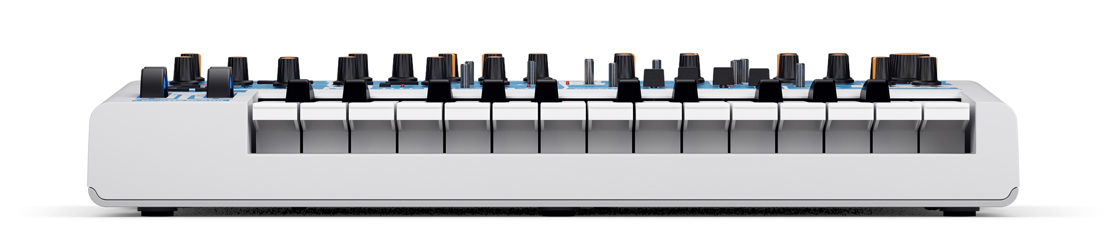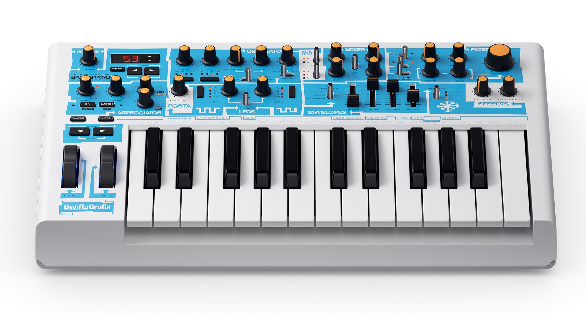 Analógový syntezátor Ian "Swifty" Swift Limitovaná edícia populárneho analógového syntetizátora navrhnutá v spolupráci s legendárnym grafikom Swiftym. Široká škála zvukov Dva laditeľné analógové oscilátory so synchronizáciou a výberom štyroch tvarov vlny, suboscilátor, generátor šumu a kruhová modulácia. Silné basy a kričiace sóla Prepínanie klasického filtra medzi režimami dolnej, pásmovej a hornej priepuste s možnosťou výberu orezania 12 alebo 24 dB na ok