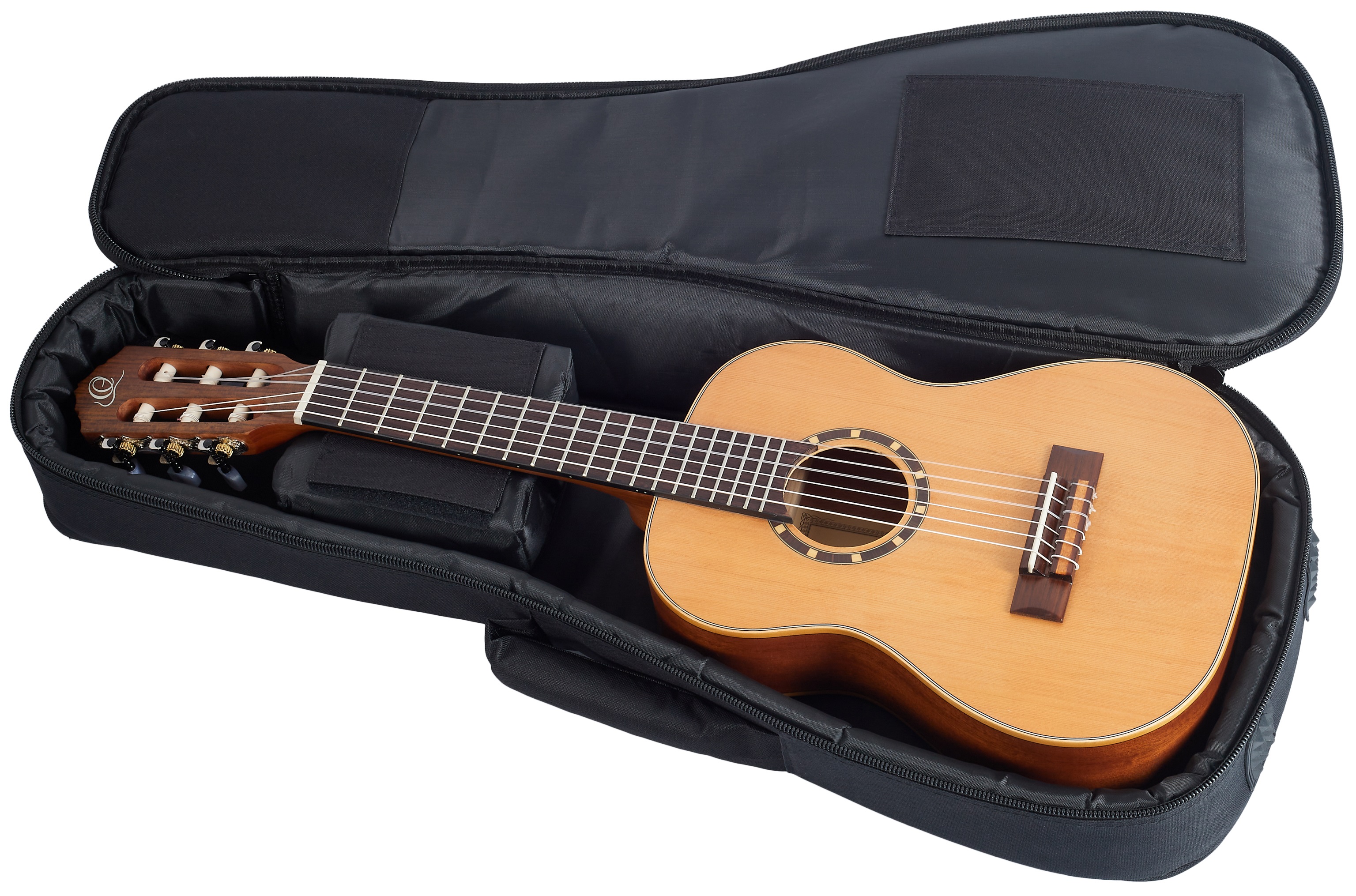Obal na klasickú gitaru Taška na klasickú gitaru zo série Ortega Pro je vyrobená z odolného nylonu. Bohaté vnútorné polstrovanie a špeciálna výstuha na krk s bezpečnostným úchytom zabezpečujú dokonalú ochranu vášho nástroja. Puzdro je tiež vybavené spoľahlivým systémom zipsov, širokými a pohodlnými ramennými popruhmi s nastaviteľnou dĺžkou a polstrovanou rukoväťou na boku. Do dvoch veľkých vonkajších vreciek možno ľahko uložiť akékoľvek príslušenstvo vrátane notového materiálu. Gig bag je vhodný pre klasick