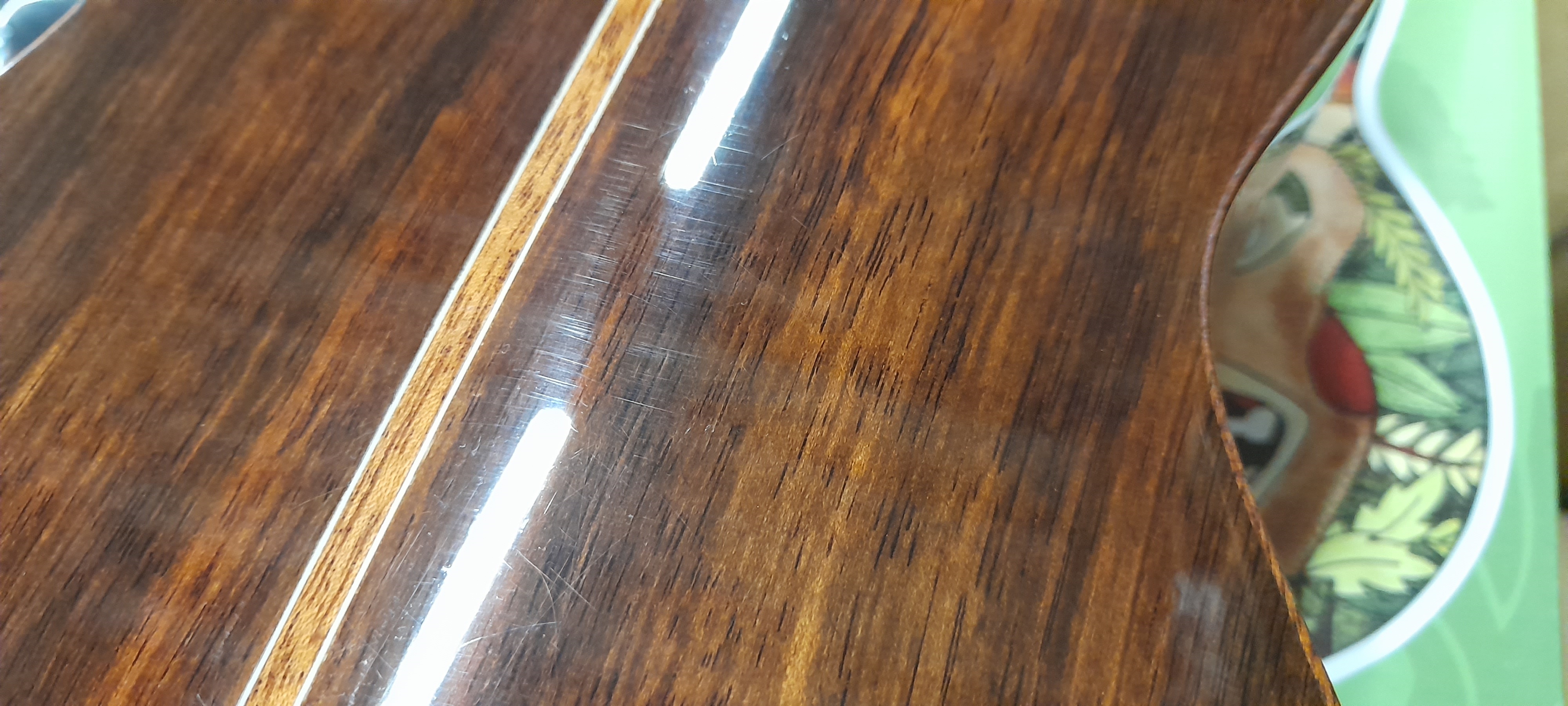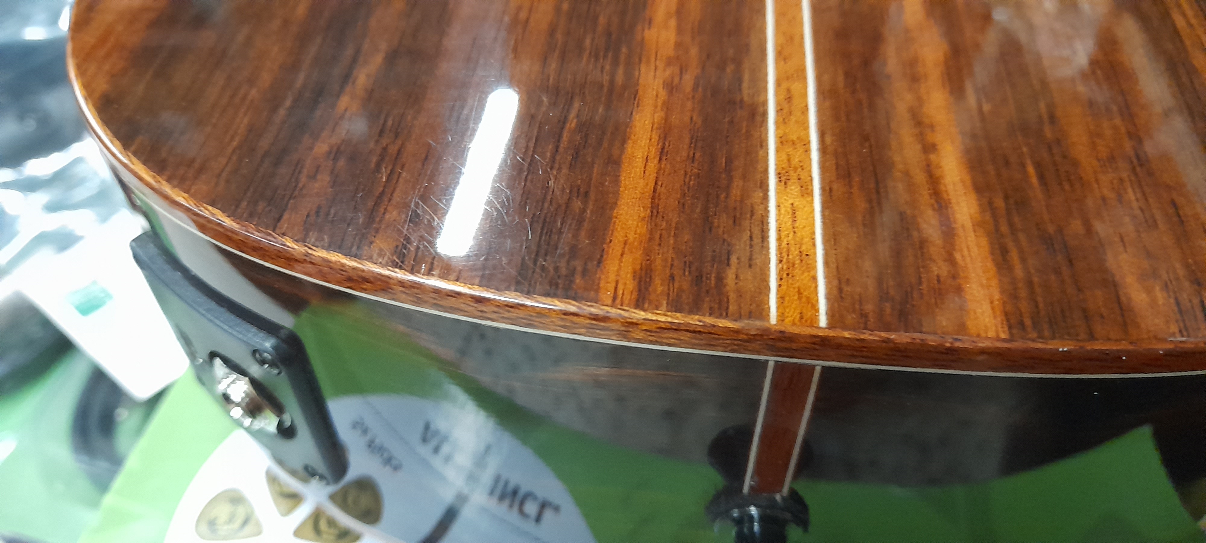 Elektroakustické ukulele Tovar vykazuje známky opotrebenia v dôsledku častého používania alebo dlhodobého vystavenia v obchode (pozri foto). Séria Ortega Elite ponúka polotuhé ukulele vyrobené z vybraných exotických drevín. Koncertné ukulele RUET-EB má masívnu ebenovú prednú dosku, doplnenú o ebenovú zadnú dosku a bočnice z preglejky. Výraznú kresbu dreva zdôrazňuje lesklý povrch. Mahagónový krk je vybavený orechovým hmatníkom, zdobeným dekoratívnou intarziou „Tree of Life“ z imitácie perlete. Nástroj je zo