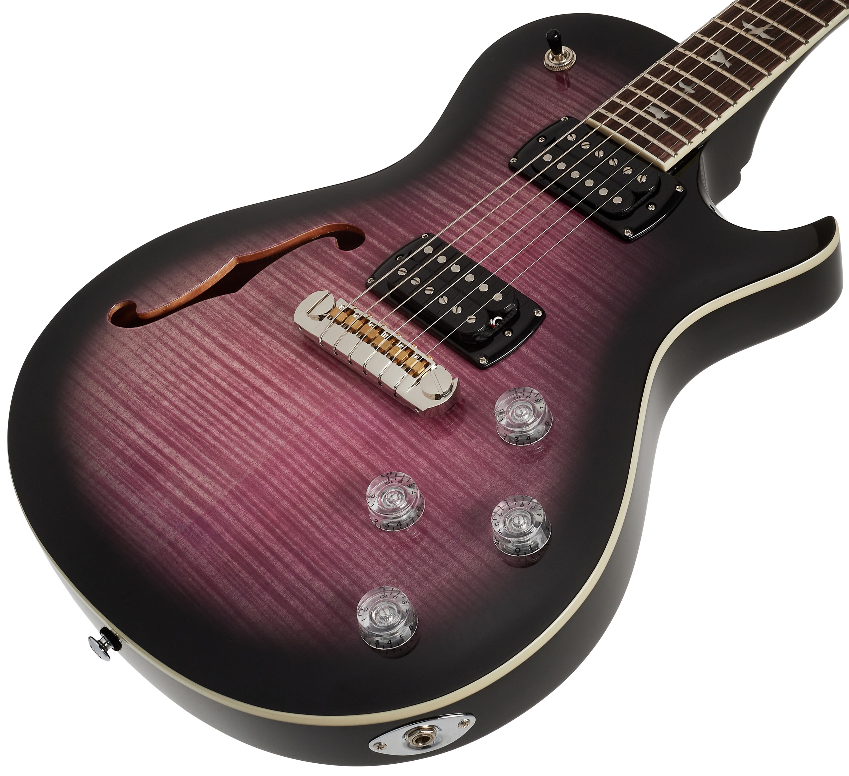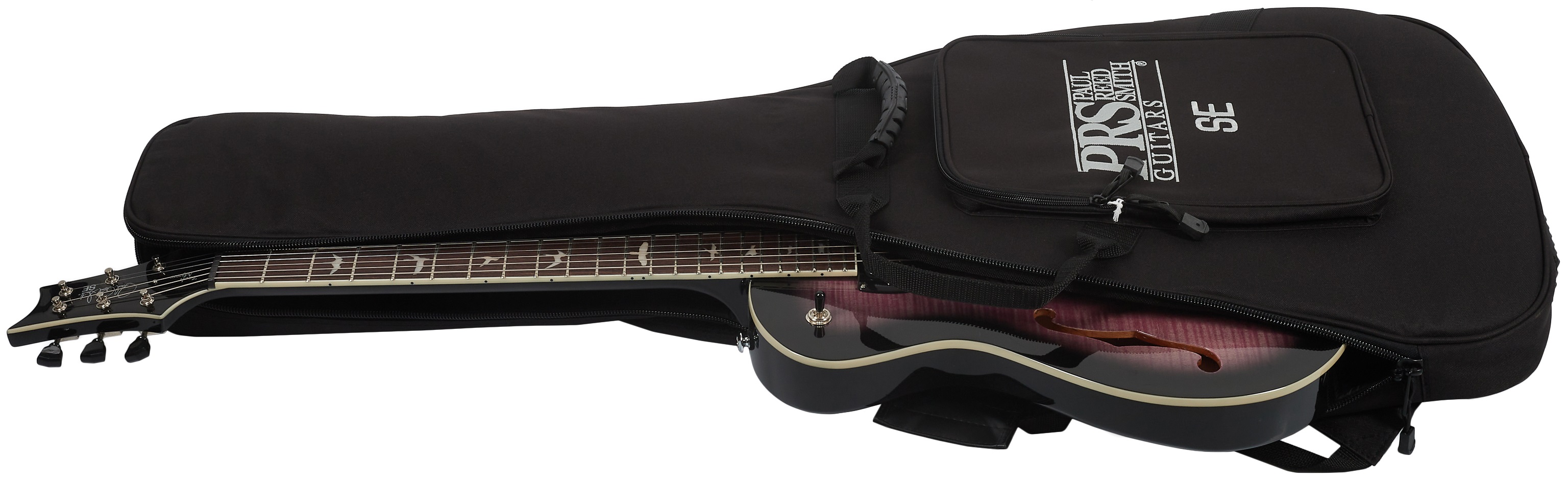 Semiakustická gitara Elektrická gitara SE Zach Myers Purple Burst 2026 je single-cut signature model od Zacha Myersa, gitaristu americkej kapely Shinedown. Komorové mahagónové telo je zdobené javorovou vrchnou doskou, nápadnou dyhou z plamenného javora a F-otvorom. Vykrojok Shallow Violin približuje hracie vlastnosti nástroja drahším americkým modelom série Core. Mahagónový krk s profilom Wide Fat a saténovým povrchom je vybavený palisandrovým hmatníkom s dvadsiatimi dvoma