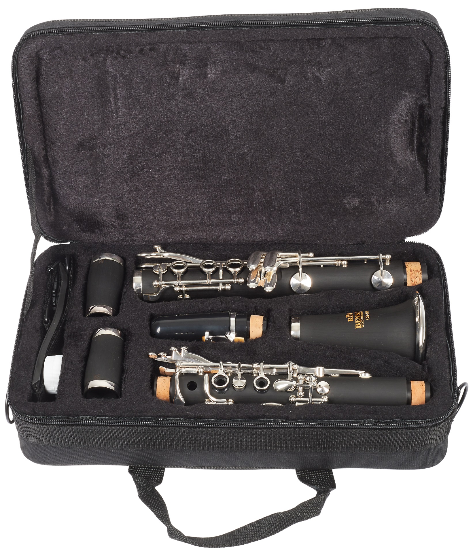 Klarinet Drevené dychové nástroje Roy Benson sú určené predovšetkým pre začínajúcich hudobníkov a poskytujú kvalitné spracovanie a plnohodnotné funkcie za dostupnú cenu. B klarinet s označením CB-218 je vyrobený z plastového materiálu ebonit. Má francúzsky systém pražcov (Boehm), mechaniku pakfong, osemnásť klapiek, šesť skiel a kobylku Es. Súčasťou balenia je náustok, ligatúra, uzáver, mazadlo a číselník. Klarinet sa dodáva v puzdre so zadnými popruhmi.