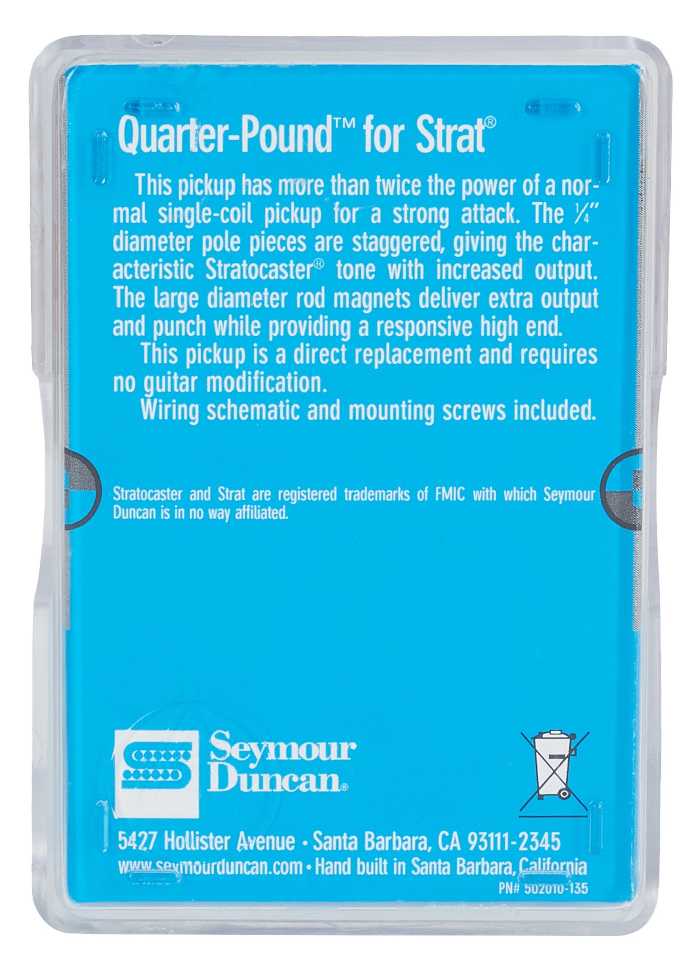Snímač na elektrickú gitaru Seymour Duncan SSL-7 RW/RP Quarter Pound Staggered Strat je moderný vysoko výkonný snímač pre Stratocaster s magnetmi Alnico V a zvýšenými pólovými nástavcami s viac ako dvojnásobným výkonom oproti tradičnému jednocievkovému snímaču Strat, ktorý dodá vášmu Stratocasteru plný, úderný tón s definovanými výškami a výraznejšou odozvou v strednom pásme. Veľký, plný zvuk snímača vynikne v akordoch, rozkladoch akordov a gitarových sólach a hudobných štýloch, ako sú blues, klasický a gar
