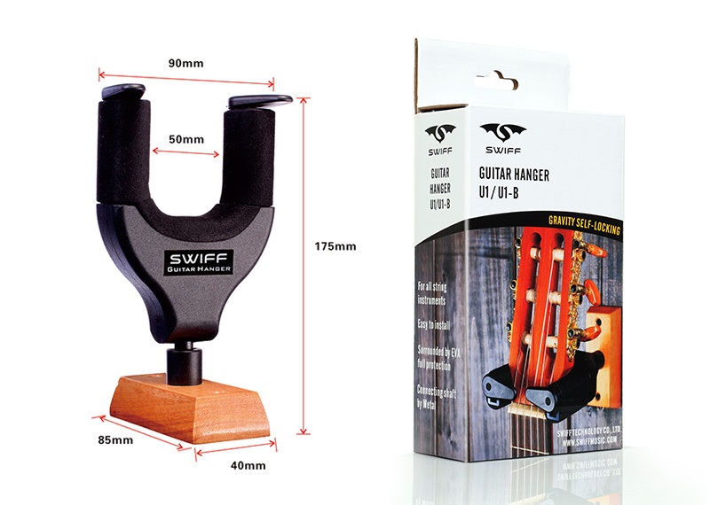 Gitarový vešiak Gitarový stojan Swiff U1 ponúka dokonalé riešenie na zavesenie vášho nástroja. Má ochranné zámky, ktoré sa po vložení nástroja automaticky zatvoria, čím zabránia jeho pádu a prípadnému poškodeniu nástroja. Otočná hlava stojana sa prispôsobí rôznym tvarom gitarových hláv a iných nástrojov, takže spoľahlivo udrží napríklad akustickú, klasickú, elektrickú gitaru, basgitaru, mandolínu alebo banjo. Všetky časti stojana, ktoré sa dotýkajú nástroja, sú vystlané mäkkou penou, takže