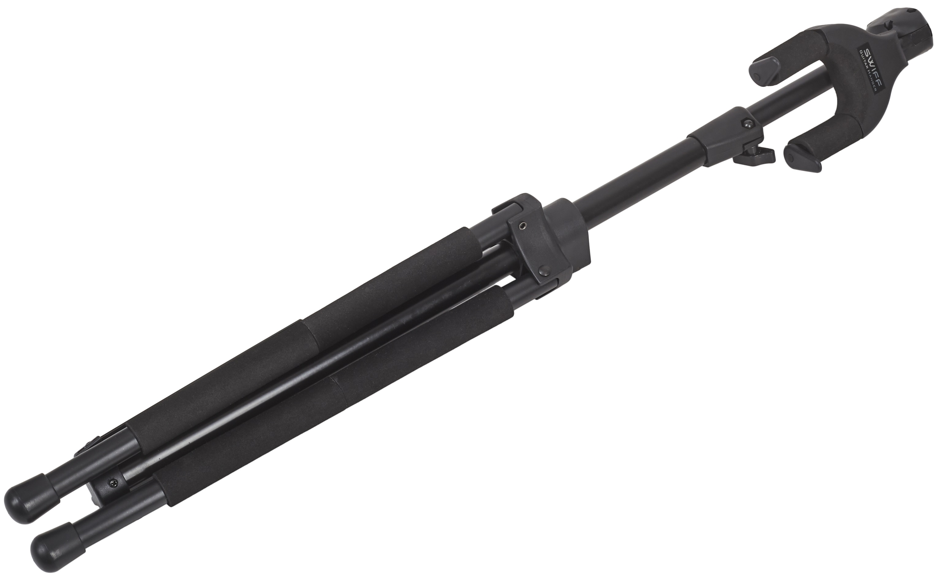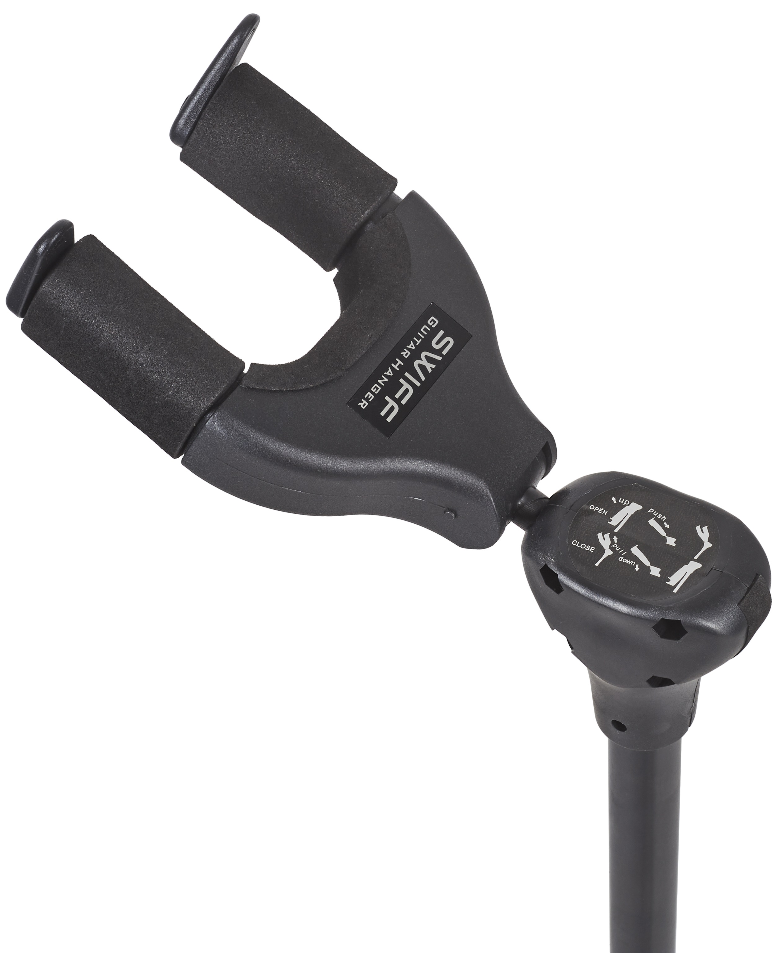 Gitarový stojan Stojan na gitaru Swiff U4 je stabilný skladací stojan na trojnožke, ktorý udrží váš nástroj vždy po ruke a v bezpečí. Hlava stojana má ochranné zámky, ktoré sa po vložení gitary automaticky zatvoria, čím zabránia jej pádu a prípadnému poškodeniu. V spodnej časti spočíva gitara na polstrovanej základni. Všetky ostatné časti stojana, ktoré sa dotýkajú nástroja, sú tiež vystlané mäkkou penou, takže sa nemusíte obávať poškriabania. Stojan je vhodný pre akustické aj elektrické gi