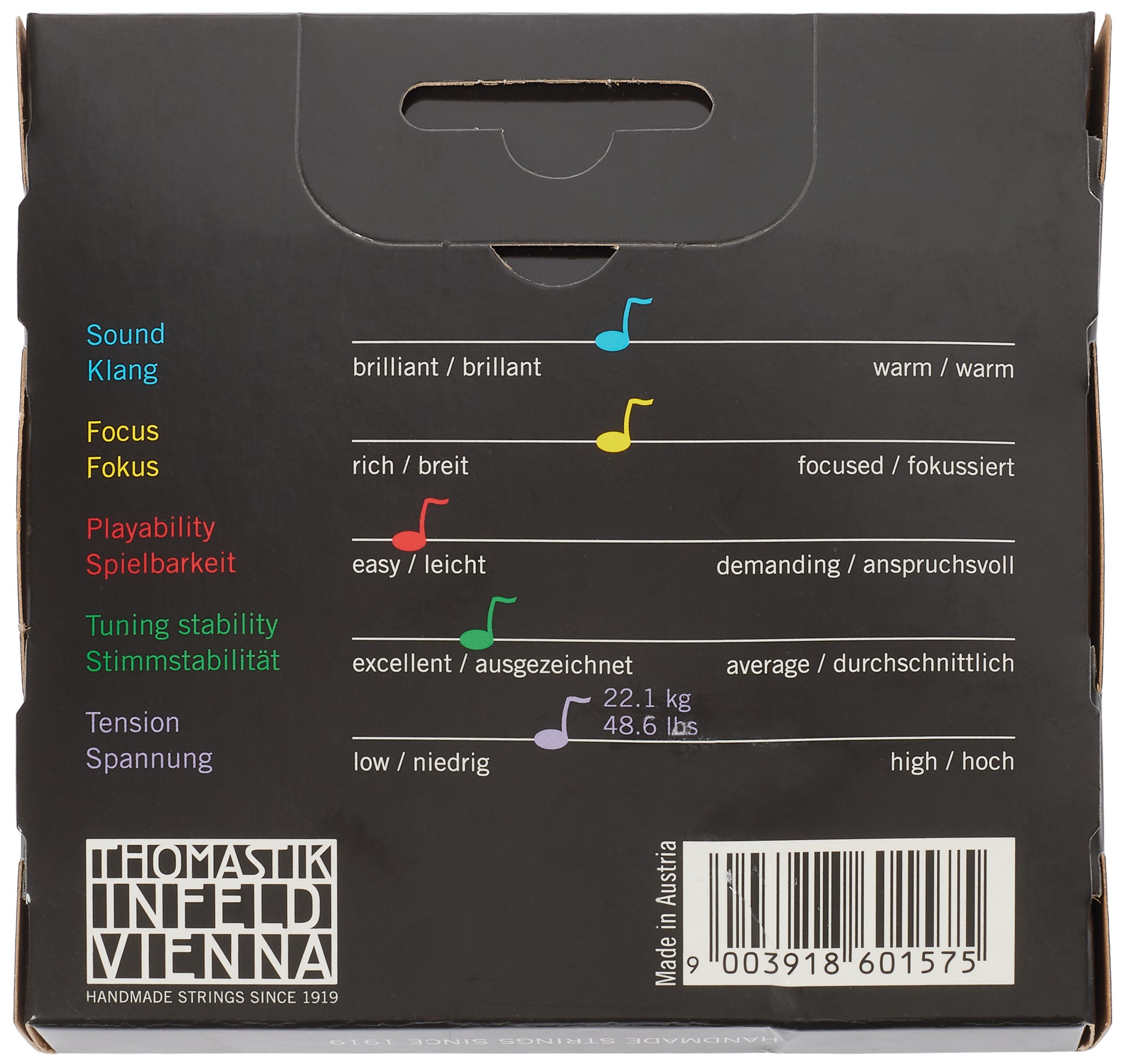 Husľové struny Husľové struny Thomastik Vision Titanium Orchestra majú jadro z pokročilého syntetického materiálu, ktorý zaručuje vynikajúcu odozvu sláčika. Tieto struny boli navrhnuté ako alternatíva k strunám z prírodných čriev a možno ich s nimi efektívne kombinovať. Ponúkajú plný a farebný tón, ktorý je ideálny na orchestrálnu a komornú hru, ale často ich používajú aj sólisti. Struny sa veľmi rýchlo usadzujú a ich ladenie zostáva stabilné. Sú zakončené guľôčkou, ktorá je vyrobená zo zliatiny titanalu, č
