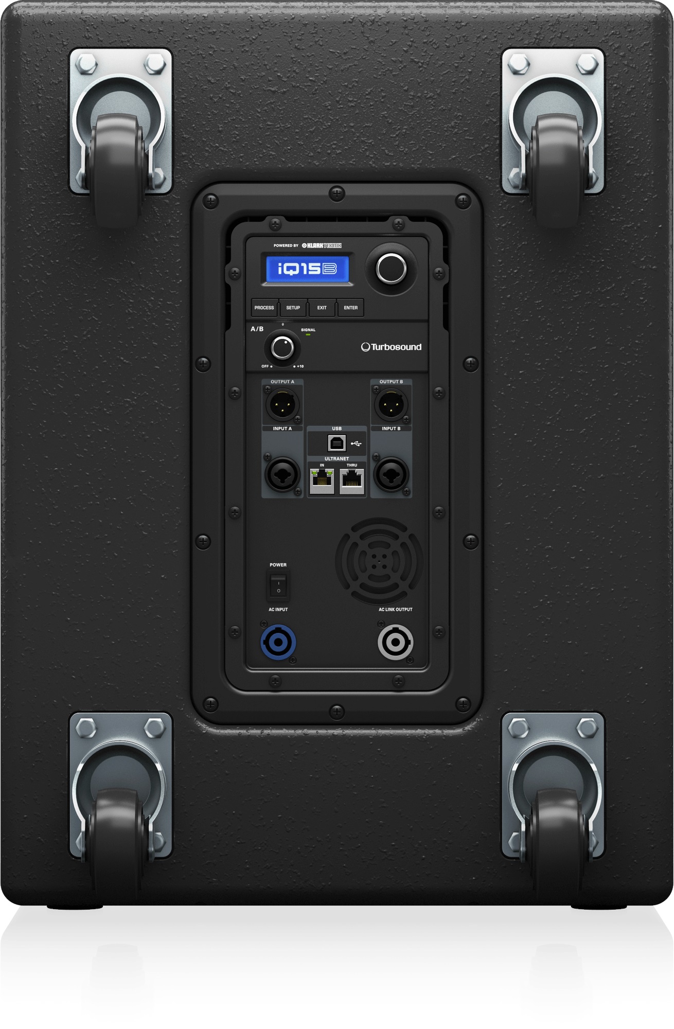 Aktívny subwoofer Turbosound iQ15B je aktívny subwoofer s maximálnym výkonom 3000 W zosilňovača triedy D Klark Teknik, 15-palcovým reproduktorom so 4-palcovou kmitacou cievkou a dvojitým zavesením, digitálnym procesorom Klark Teknik, frekvenčným rozsahom 40 Hz – 130 Hz (-10 dB), maximálnym akustickým tlakom 130 dB, ovládaním úrovne kanálov A a B, otočný ovládač pre prístup k predvoľbám, ekvalizér, funkcie Speaker modelling a Feedback Control (FBI), dva kombinované vstupy jack/XLR, výstupy XLR kanálov A a B,