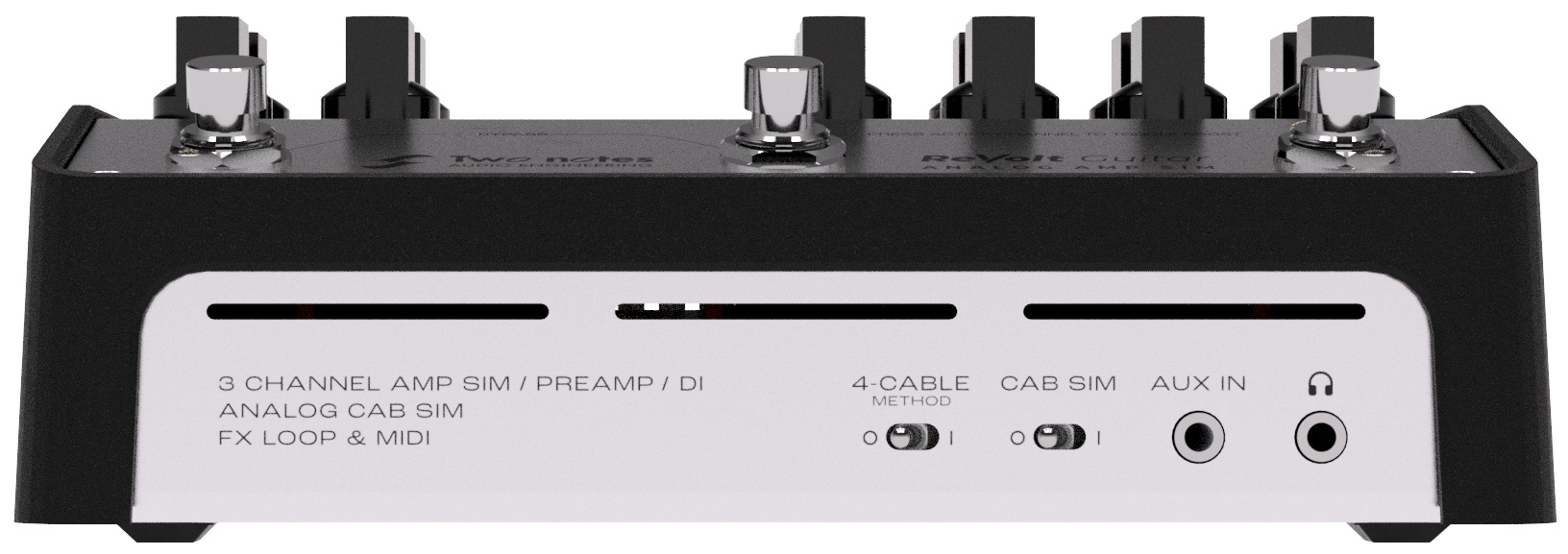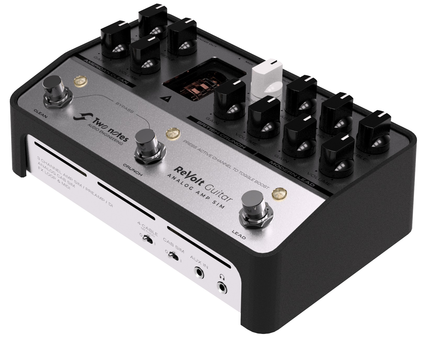 Gitarový predzosilňovač Two Notes ReVolt Guitar je plne analógový trojkanálový gitarový predzosilňovač, ktorý sa môže ľahko stať centrálnym nervovým uzlom vašej gitarovej zostavy. Zabudnite na predsudky týkajúce sa zosilňovačov v krabičkách – ReVolt Guitar je napájaný 200 voltmi, skutočnou predzosilňovačovou lampou 12AX7 a má tri kanály (American Clean, British Crunch, Modern Lead) inšpirované slávnymi gitarami, Obvody OD/Boost na jednoduché posúvanie v mixe, kompatibilita s MIDI a vyvážený DI XLR výstup s