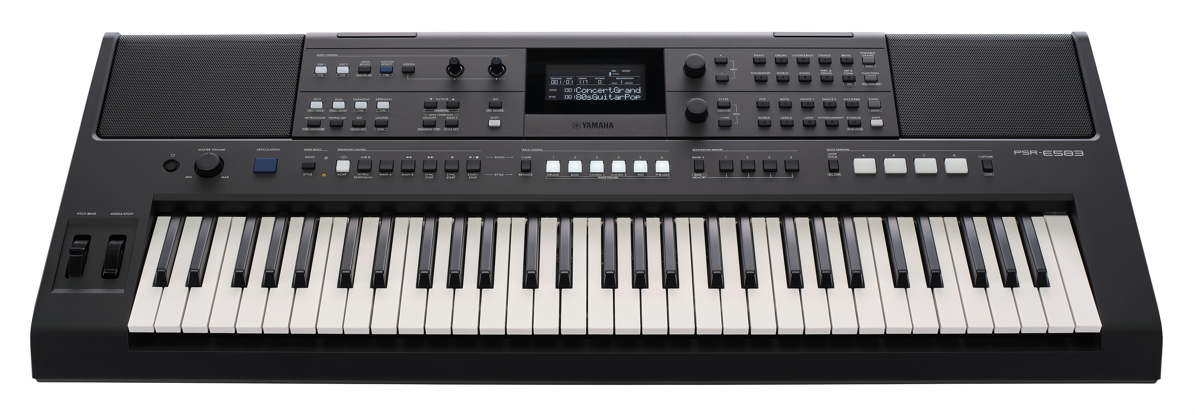 Klávesy s dynamikou úderu Yamaha PSR-E583 je univerzálny prenosný klávesový nástroj s 61 dynamickými klávesmi, ktorý ponúka ideálnu rovnováhu medzi jednoduchou obsluhou a pokročilými funkciami. Je to najvyšší model v sérii PSR-E, čo je zvlášť evidentné v jeho bohatej zvukovej knižnici, výkonnom zvukovom systéme a expresívnych ovládacích prvkoch – ovládací panel je vybavený kolieskom pitch bend a modulácie a je tu aj vstup pre externý expresívny pedál. Nástr